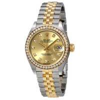 Stainless steel case with a stainless steel Rolex jubilee bracelet with 18kt yellow gold center links.. Fixed 18kt yellow gold bezel set with diamonds. Champagne dial with yellow gold-tone hands and diamond hour markers. Dial Type: Analog. Date display at the 3 o'clock position. Rolex calibre 2236 automatic movement, based upon Rolex 2235, containing 31 Jewels, bitting at 28800 vph, and has a power reserve of approximately 55 hours. Scratch resistant sapphire crystal. Screw down crown. Solid case back. Round case shape. Case size: 28 mm. Concealed crown clasp. Water resistant at 100 meters / 330 feet. Functions: date, hour, minute, second, chronometer. Lady Datejust Series. Luxury watch style. Watch label: Swiss Made. Item Variations: 279383-63343. Rolex Lady Datejust Champagne Diamond Dial Automatic Watch 279383CDJ. CASE Case Size: 28 Case Color: Silver-Tone Case Material: Stainless Steel Case Shape: Round Case Back: Solid BAND Band Material: Stainless Steel and 18kt Yellow Gold Rolex Jubilee Band Type: Bracelet Band Color: Two-tone (Silver-tone and Yellow Gold-tone) Clasp: Concealed Crown DIAL Dial Color: Champagne Type: Analog Crystal: Scratch Resistant Sapphire Hands: Yellow Gold-tone Dial Markers: Diamond Bezel: Fixed Bezel Color: 18kt Yellow Gold Bezel Material: 18kt Yellow Gold set with Diamonds Crown: Screw Down INFORMATION Brand: Rolex Series: Lady Datejust Collection Name: Lady Datejust Gender: Womens Model: M279383RBR-0011 Watch Label: Swiss Made Movement: Automatic Engine: Rolex Calibre 2236 Power Reserve: 55 hours FEATURES Water Resistance: 100 meters / 330 feet Calendar: Date display at the 3 o'clock position Functions: Date, Hour, Minute, Second, Chronometer Watch Features: Diamond, Stainless Steel, Gold, Chronometer, Analog ADDITIONAL INFO Watch Style: Luxury Warranty: 2 Year Jomashop Warranty UPC Code: 842047109670 Jomashop Sku: RLX279383CDJ Item Variation: 279383RBR-0011, 279383CDJ, 279383-63343 Department: Watches Category: Watches