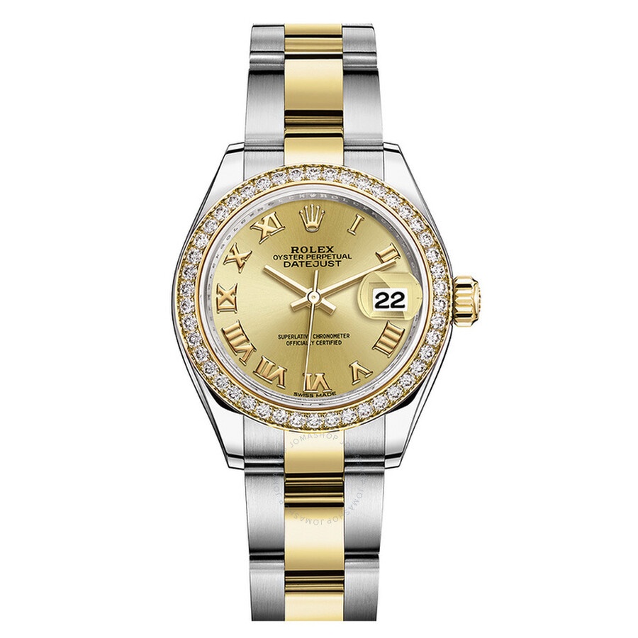 Stainless steel and 18k yellow gold case with a stainless steel and 18k yellow gold Rolex Oyster bracelet. Fixed, diamond-set bezel. Champagne dial with yellow gold-tone hands and Roman numeral hour markers. Dial Type: Analog. Date display at the 3 o'clock position. Automatic movement. Scratch resistant sapphire crystal. Solid case back. Case size: 28 mm. Round case shape. Concealed crown clasp. Water resistant at 100 meters / 330 feet. Functions: date, hour, minute, second. Luxury watch style. Watch label: Swiss Made. Rolex Lady Datejust Champagne Roman Dial Diamond Bezel Automatic Watch 279383CRO. INFORMATION Brand: Rolex Series: Lady Datejust Collection Name: Lady Datejust Gender: Womens Model: 279383CRO Watch Label: Swiss Made Movement: Automatic Engine: Rolex Calibre 2236 Power Reserve: 55 hours CASE Case Size: 28 mm Case Material: Stainless Steel and 18kt Yellow Gold Case Shape: Round Case Back: Solid BAND Band Material: Stainless Steel and 18kt Yellow Gold Rolex Oyster Band Type: Bracelet Band Color: Two-tone (Silver-tone and Yellow Gold-tone) Clasp: Concealed Crown DIAL Dial Color: Champagne Type: Analog Crystal: Scratch Resistant Sapphire Hands: Yellow Gold-Tone Dial Markers: Roman Numeral Bezel: Fixed Bezel Color: 18kt Yellow Gold Bezel Material: Diamond Set Crown: Screw Down FEATURES Water Resistance: 100 meters / 330 feet Calendar: Date display at the 3 o'clock position Functions: Date, Hour, Minute, Second, Chronometer Watch Features: Diamond, Stainless Steel, Gold, Chronometer, Analog ADDITIONAL INFO Watch Style: Luxury Warranty: 2 Year Jomashop Warranty Jomashop Sku: RLX279383CRO Department: Watches Category: Watches