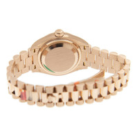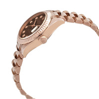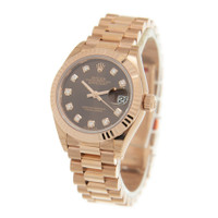 18kt rose gold case with a 18kt rose gold President bracelet. Fixed fluted 18kt rose gold bezel. Chocolate dial with rose gold-tone hands and diamond hour markers. Dial Type: Analog. Date display at the 3 o'clock position. Rolex calibre 2236 automatic movement, based upon Rolex 2235, containing 31 Jewels, bitting at 28800 vph, and has a power reserve of approximately 55 hours. Scratch resistant sapphire crystal. Screw down crown. Solid case back. Round case shape. Case size: 28 mm. Concealed fold over clasp. Water resistant at 100 meters / 330 feet. Functions: date, hour, minute, second. Lady Datejust Series. Luxury watch style. Watch label: Swiss Made. Item Variations: m279175-0016, 279175-0016. Rolex Lady Datejust Chocolate Diamond Dial Automatic 18 Carat Rose Gold President Watch 279175CHDP. INFORMATION Brand: Rolex Series: Lady Datejust Collection Name: Lady Datejust Gender: Womens Model: 279175CHDP Watch Label: Swiss Made Movement: Automatic Engine: Rolex Calibre 2236 Power Reserve: 55 hours CASE Case Size: 28 mm Case Material: 18kt Rose Gold Case Shape: Round Case Back: Solid BAND Band Material: 18kt Rose Gold President Band Type: Bracelet Clasp: Concealed Fold Over DIAL Dial Color: Chocolate Type: Analog Crystal: Scratch Resistant Sapphire Hands: Rose Gold-tone Dial Markers: Diamond Bezel: Fixed Fluted Bezel Material: 18kt Rose Gold Crown: Screw Down FEATURES Water Resistance: 100 meters / 330 feet Calendar: Date display at the 3 o'clock position Functions: Date, Hour, Minute, Second Watch Features: Diamond, Gold, Analog ADDITIONAL INFO Watch Style: Luxury Warranty: 2 Year Jomashop Warranty Jomashop Sku: RLX279175CHDP Item Variation: M279175-0016, 279175-0016 Department: Watches Category: Watches