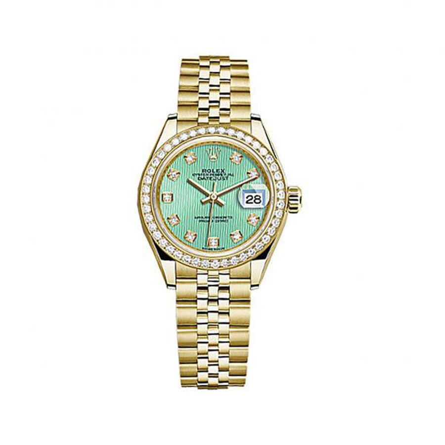 18 carat yellow gold case with a 18 carat yellow gold jubilee bracelet. Fixed-diamond set bezel. Mint green dial with gold-tone hands and diamonds hour markers. Dial Type: Analog. Date display at the 3 o'clock position. Rolex Calibre 2236 automatic movement with about 55 hours of power reserve. Scratch resistant sapphire crystal. Screw down crown. Solid case back. Case size: 28 mm. Round case shape. Water resistant at 100 meters / 330 feet. Functions: date, hour, minute, second. Luxury watch style. Watch label: Swiss Made. Rolex Lady-Datejust Mint Green Dial Automatic 18 Carat Yellow Gold Watch 279138GNDJ. INFORMATION Brand: Rolex Series: Lady Datejust Collection Name: Lady Datejust Gender: Womens Model: 279138GNDJ Watch Label: Swiss Made Movement: Automatic Engine: Rolex Calibre 2236 Power Reserve: 55 hours CASE Case Size: 28 mm Case Material: 18kt Yellow Gold Case Shape: Round Case Back: Solid BAND Band Material: 18kt Yellow Gold Jubilee Band Type: Bracelet Band Color: Yellow Gold-tone DIAL Dial Color: Mint Green Type: Analog Crystal: Scratch Resistant Sapphire Hands: Gold-tone Dial Markers: Diamonds Bezel: Fixed Bezel Color: 18kt Yellow Gold Bezel Material: Diamond Set Crown: Screw Down FEATURES Water Resistance: 100 meters / 330 feet Calendar: Date display at the 3 o'clock position Functions: Date, Hour, Minute, Second Watch Features: Diamond, Gold, Analog ADDITIONAL INFO Watch Style: Luxury Warranty: 2 Year Jomashop Warranty Jomashop Sku: RLX279138GNDJ Department: Watches Category: Watches