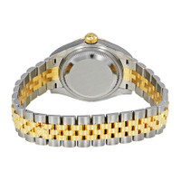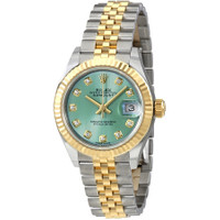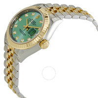 Stainless steel case with a stainless steel Rolex jubilee bracelet with 18kt yellow gold center links. Fixed 18kt yellow gold bezel. Mint green stripe dial with gold-tone hands and diamond hour markers. Dial Type: Analog. Date display at the 3 o'clock position. Automatic movement. Scratch resistant sapphire crystal. Screw down crown. Solid case back. Case size: 28 mm. Round case shape. Oysterlock clasp. Water resistant at 100 meters / 330 feet. Functions: date, hour, minute, second. Luxury watch style. Watch label: Swiss Made. Rolex Lady Datejust Mint Green Diamond Dial Automatic Ladies Watch 279173GNSDJ. INFORMATION Brand: Rolex Series: Oyster Perpetual Collection Name: Oyster Perpetual Gender: Womens Model: 279173GNSDJ Watch Label: Swiss Made Movement: Automatic Engine: Rolex Calibre 2236 Power Reserve: 55 hours CASE Case Size: 28 mm Case Material: Stainless Steel and 18kt Yellow Gold Case Shape: Round Case Back: Solid BAND Band Material: Stainless Steel and 18K Yellow Gold Rolex Jubilee Band Type: Bracelet Band Color: Two-tone (Silver-tone and Yellow Gold-tone) Clasp: Oysterlock DIAL Dial Color: Mint Green Stripe Type: Analog Crystal: Scratch Resistant Sapphire Hands: Gold-Tone Dial Markers: Diamond Bezel: Fixed Bezel Material: 18kt Yellow Gold Crown: Screw Down FEATURES Water Resistance: 100 meters / 330 feet Calendar: Date display at the 3 o'clock position Functions: Date, Hour, Minute, Second, Chronometer Watch Features: Analog, Chronometer, Perpetual, Gold, Stainless Steel, Diamond ADDITIONAL INFO Watch Style: Luxury Warranty: 2 Year Jomashop Warranty UPC Code: 842047109588 Jomashop Sku: RLX279173GNSDJ Item Variation: 279173-63343 Department: Watches Category: Watches