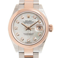 Stainless steel and 18k everose gold case with a stainless steel and 18k everose gold Rolex Oyster bracelet. Fixed - domed 18k everose gold bezel. Mother of pearl dial with rose gold-tone hands and diamond hour markers. Dial Type: Analog. Date display at the 3 o'clock position. Automatic movement. Scratch resistant sapphire crystal. Screw down crown. Solid case back. Case size: 28 mm. Round case shape. Oysterlock clasp. Water resistant at 100 meters / 330 feet. Functions: date, hour, minute, second. Luxury watch style. Watch label: Swiss Made. Rolex Lady Datejust Mother of Pearl Diamond Oyster Watch 279161MDO. INFORMATION Brand: Rolex Series: Lady Datejust Collection Name: Lady Datejust Gender: Womens Model: 279161MDO Watch Label: Swiss Made Movement: Automatic Engine: Rolex Calibre 2236 Power Reserve: 55 hours CASE Case Size: 28 mm Case Material: Stainless Steel and 18kt Everose Gold Case Shape: Round Case Back: Solid BAND Band Material: Stainless Steel and 18K Everose Gold Rolex Oyster Band Type: Bracelet Band Color: Two-tone (Silver-tone and Gold-tone) Clasp: Oysterlock DIAL Dial Color: Mother of Pearl Type: Analog Crystal: Scratch Resistant Sapphire Hands: Rose Gold-Tone Dial Markers: Diamond Bezel: Fixed Domed Bezel Material: 18kt Everose Gold Crown: Screw Down FEATURES Water Resistance: 100 meters / 330 feet Calendar: Date display at the 3 o'clock position Functions: Date, Hour, Minute, Second, Chronometer Watch Features: Diamond, Stainless Steel, Gold, Chronometer, Analog ADDITIONAL INFO Watch Style: Luxury Warranty: 2 Year Jomashop Warranty Jomashop Sku: RLX279161MDO Department: Watches Category: Watches
