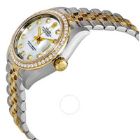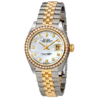 Stainless steel case with a stainless steel Rolex jubilee bracelet with 18kt yellow gold center links. Fixed 18kt yellow gold bezel set with diamonds. Mother of pearl dial with yellow gold-tone hands and diamond hour markers. Dial Type: Analog. Date display at the 3 o'clock position. Rolex calibre 2236 automatic movement with a 55-hour power reserve. Scratch resistant sapphire crystal. Screw down crown. Solid case back. Case size: 28 mm. Round case shape. Concealed crown clasp. Water resistant at 100 meters / 330 feet. Functions: date, hour, minute, second, chronometer. Luxury watch style. Watch label: Swiss Made. Rolex Lady Datejust Mother of Pearl Diamond Stainless Steel and 18K Yellow Gold Jubilee Watch 279383MDJ. GENERAL Box Type: Original Box CASE Case Diameter: 28 mm Case Color: Silver-Tone Case Material: Stainless Steel Case Shape: Round Case Back: Solid BAND Band Material: Stainless Steel and 18kt Yellow Gold Rolex Jubilee Band Type: Bracelet Band Color: Silver-tone Clasp: Concealed Crown DIAL Dial Color: Mother of Pearl Type: Analog Crystal: Scratch Resistant Sapphire Hands: Yellow Gold-tone Dial Markers: Diamond Bezel: Fixed Bezel Color: 18kt Yellow Gold Bezel Material: Diamond Set Crown: Screw Down INFORMATION Brand: Rolex Series: Lady-Datejust Collection Name: Lady-Datejust Gender: Mens Model: 279383RBR-0019 Watch Label: Swiss Made Movement: Automatic Engine: Rolex Calibre 2236 Power Reserve: 55 hours FEATURES Water Resistance: 100 meters / 330 feet Calendar: Date display at the 3 o'clock position Functions: Date, Hour, Minute, Second, Chronometer Watch Features: Analog, Chronometer, Gold, Stainless Steel, Diamond ADDITIONAL INFO Watch Style: Luxury Warranty: 2 Year Jomashop Warranty UPC Code: 842047109953 Jomashop Sku: RLX279383MDJ Item Variation: 279383-63343, M279383RBR-0019, 279383MDJ Department: Watches Category: Watches