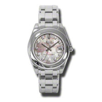 18kt white gold case with a 18kt white gold rolex pearlmaster bracelet. Fixed domed 18kt white gold bezel. Goldust dream mother of pearl dial with silver-tone hands and diamond hour markers. Dial Type: Analog. Date display at the 3 o'clock position. Rolex Calibre 2235 Automatic movement, containing 31 Jewels, bitting at 28800 vph, and has a power reserve of approximately 48 hours. Scratch resistant sapphire crystal. Screw down crown. Solid case back. Round case shape. Case size: 34 mm. Band width: 17 mm. Concealed crown clasp. Water resistant at 100 meters / 330 feet. Functions: date, hour, minute, second, chronometer. Luxury watch style. Watch label: Swiss Made. Rolex Lady-Datejust Pearlmaster Goldust Dream Mother Of Pearl Diamond Dial 18K White Gold Automatic Ladies Watch 81209GDDPM. GENERAL Color: Gold / Mother of pearl / White INFORMATION Brand: Rolex Series: Lady-Datejust Pearlmaster Collection Name: Lady-Datejust Pearlmaster Gender: Womens Model: 81209GDDPM Watch Label: Swiss Made Movement: Automatic Engine: Rolex Calibre 2235 Power Reserve: 48 hours CASE Case Size: 34 mm Case Material: 18kt White Gold Case Shape: Round Case Back: Solid BAND Band Material: 18kt White Gold Rolex Pearlmaster Band Type: Bracelet Band Width: 17 mm Clasp: Concealed Crown DIAL Dial Color: Goldust Dream mother of pearl Type: Analog Crystal: Scratch Resistant Sapphire Hands: Silver-Tone Dial Markers: Diamond Bezel: Fixed Domed Bezel Material: 18kt White Gold Crown: Screw Down FEATURES Water Resistance: 100 meters / 330 feet Calendar: Date display at the 3 o'clock position Functions: Date, Hour, Minute, Second, Chronometer Watch Features: Diamond, Gold, Chronometer, Analog ADDITIONAL INFO Watch Style: Luxury Warranty: 2 Year Jomashop Warranty UPC Code: 845960082327 Jomashop Sku: RLX81209GDDPM Department: Watches Category: Watches