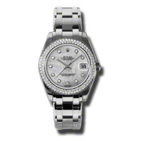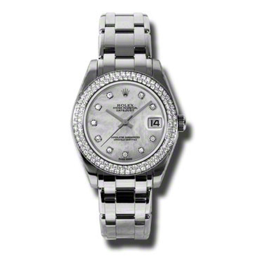 18kt white gold case with a 18kt white gold rolex pearlmaster bracelet. Fixed 18kt white gold 116 diamond set bezel. Mother of pearl dial with silver-tone hands and diamond hour markers. Dial Type: Analog. Date display at the 3 o'clock position. Rolex Calibre 2235 Automatic movement, containing 31 Jewels, bitting at 28800 vph, and has a power reserve of approximately 48 hours. Scratch resistant sapphire crystal. Screw down crown. Solid case back. Round case shape. Case size: 34 mm. Band width: 17 mm. Concealed crown clasp. Water resistant at 100 meters / 330 feet. Functions: date, hour, minute, second, chronometer. Luxury watch style. Watch label: Swiss Made. Rolex Lady-Datejust Pearlmaster Mother Of Pearl Diamond Dial 18K White Gold Automatic Ladies Watch 81339MDPM. GENERAL Color: Gold / Mother of pearl / White INFORMATION Brand: Rolex Series: Lady-Datejust Pearlmaster Collection Name: Lady-Datejust Pearlmaster Gender: Womens Model: 81339MDPM Watch Label: Swiss Made Movement: Automatic Engine: Rolex Calibre 2235 Power Reserve: 48 hours CASE Case Size: 34 mm Case Material: 18kt White Gold Case Shape: Round Case Back: Solid BAND Band Material: 18kt White Gold Rolex Pearlmaster Band Type: Bracelet Band Width: 17 mm Clasp: Concealed Crown DIAL Dial Color: Mother of Pearl Type: Analog Crystal: Scratch Resistant Sapphire Hands: Silver-Tone Dial Markers: Diamond Bezel: Fixed Bezel Color: 18kt White Gold Bezel Material: 116 Diamond Set Crown: Screw Down FEATURES Water Resistance: 100 meters / 330 feet Calendar: Date display at the 3 o'clock position Functions: Date, Hour, Minute, Second, Chronometer Watch Features: Diamond, Gold, Chronometer, Analog ADDITIONAL INFO Watch Style: Luxury Warranty: 2 Year Jomashop Warranty UPC Code: 845960082433 Jomashop Sku: RLX81339MDPM Department: Watches Category: Watches
