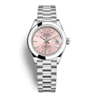 White platinum case with a white platinum rolex president bracelet. Fixed- domed white platinum bezel. Pink dial with silver-tone hands and index hour markers. Minute markers around the outer rim. Dial Type: Analog. Luminescent hands. Date display at the 3 o'clock position. Rolex Calibre 2236 Automatic movement, based upon Rolex 2235, containing 31 Jewels, bitting at 28800 vph, and has a power reserve of approximately 55 hours. Scratch resistant sapphire crystal. Screw down crown. Solid case back. Round case shape, case size: 28 mm. Folding clasp. Water resistant at 100 meters / 330 feet. Functions: date, hour, minute, second. Lady-datejust Series. Luxury watch style. Watch label: Swiss Made. Rolex Lady-Datejust Pink Dial Automatic Platinum President Watch 279166GYRP. INFORMATION Brand: Rolex Series: Lady Datejust Collection Name: Lady Datejust Gender: Womens Model: 279166PSP Watch Label: Swiss Made Movement: Automatic Engine: Rolex Calibre 2236 CASE Case Size: 28 mm Case Material: Platinum Case Shape: Round Case Back: Solid BAND Band Material: Platinum Rolex President Band Type: Bracelet Band Color: White Clasp: Folding DIAL Dial Color: Pink Type: Analog Crystal: Scratch Resistant Sapphire Hands: Silver-tone Dial Markers: Index Second Markers: Minute Markers around the outer rim Luminiscence: Hands Bezel: Fixed- Domed Bezel Color: White Bezel Material: Platinum Crown: Screw Down FEATURES Water Resistance: 100 meters / 330 feet Calendar: Date display at the 3 o'clock position Functions: Date, Hour, Minute, Second Watch Features: Platinum, Analog ADDITIONAL INFO Watch Style: Luxury Warranty: 2 Year Jomashop Warranty Jomashop Sku: RLX279166PSP Department: Watches Category: Watches