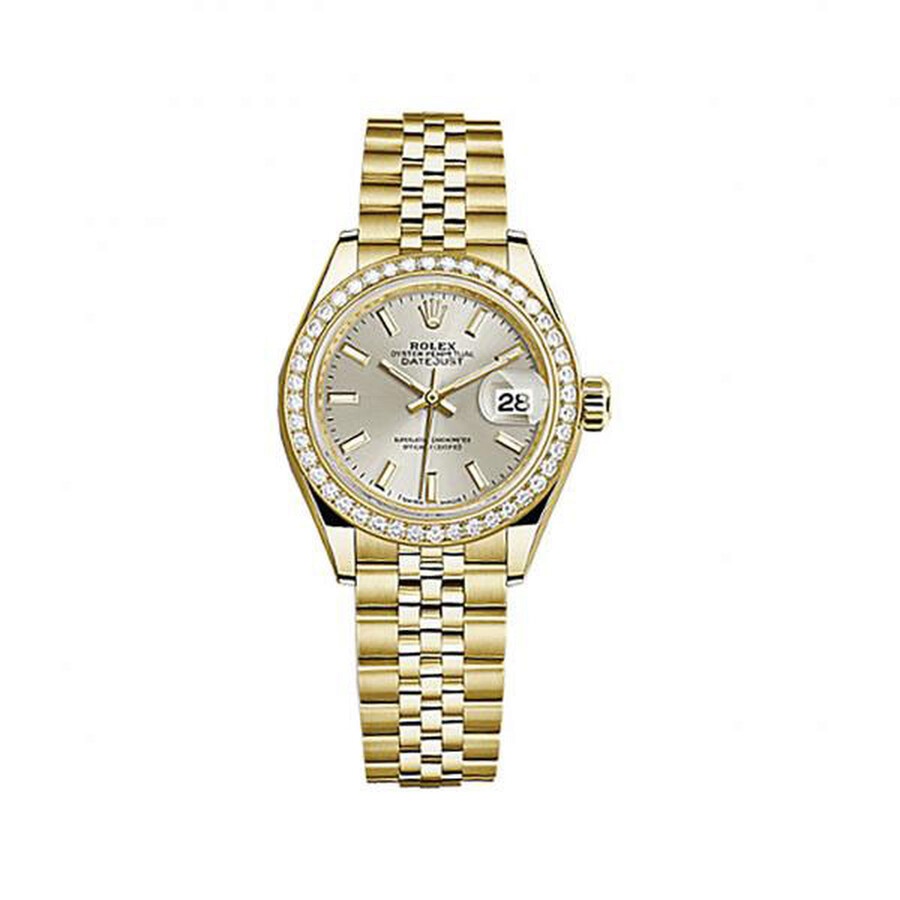18 carat yellow gold case with a 18 carat yellow gold jubilee bracelet. Fixed bezel. Silver dial with gold-tone hands and index hour markers. Dial Type: Analog. Luminescent hands and markers. Date display at the 3 o'clock position. Rolex Calibre 2236 automatic movement with about 55 hours of power reserve. Scratch resistant sapphire crystal. Screw down crown. Solid case back. Case size: 28 mm. Round case shape. Water resistant at 100 meters / 330 feet. Functions: date, hour, minute, second. Luxury watch style. Watch label: Swiss Made. Rolex Lady-Datejust Silver Dial 18 Carat Yellow Gold Jubilee Watch 279138SSJ. INFORMATION Brand: Rolex Series: Lady Datejust Collection Name: Lady Datejust Gender: Womens Model: 279138SSJ Watch Label: Swiss Made Movement: Automatic Engine: Rolex Calibre 2236 Power Reserve: 55 hours CASE Case Size: 28 mm Case Material: 18kt Yellow Gold Case Shape: Round Case Back: Solid BAND Band Material: 18kt Yellow Gold Jubilee Band Type: Bracelet Band Color: Yellow Gold-tone DIAL Dial Color: Silver Type: Analog Crystal: Scratch Resistant Sapphire Hands: Gold-tone Dial Markers: Index Luminiscence: Hands and Markers Bezel: Fixed Bezel Color: 18kt Yellow Gold Bezel Material: Diamond Set Crown: Screw Down FEATURES Water Resistance: 100 meters / 330 feet Calendar: Date display at the 3 o'clock position Functions: Date, Hour, Minute, Second Watch Features: Gold, Analog ADDITIONAL INFO Watch Style: Luxury Warranty: 2 Year Jomashop Warranty Jomashop Sku: RLX279138SSJ Department: Watches Category: Watches