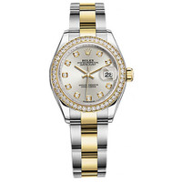 Stainless steel and 18k yellow gold case with a stainless steel and 18k yellow gold Rolex Oyster bracelet. Fixed 18k yellow gold diamond-set bezel. Silver dial with yellow gold-tone hands and diamond hour markers. Dial Type: Analog. Date display at the 3 o'clock position. Automatic movement. Scratch resistant sapphire crystal. Screw down crown. Case size: 28 mm. Round case shape. Oysterlock clasp. Water resistant at 100 meters / 330 feet. Functions: date, hour, minute, second. Luxury watch style. Watch label: Swiss Made. Rolex Lady Datejust Silver Dial Steel and 18K Yellow Gold Diamond Oyster Watch 279383SDO. INFORMATION Brand: Rolex Series: Lady Datejust Collection Name: Lady Datejust Gender: Womens Model: 279383SDO Watch Label: Swiss Made Movement: Automatic Engine: Rolex Calibre 2236 Power Reserve: 55 hours CASE Case Size: 28 mm Case Material: Stainless Steel and 18kt Yellow Gold Case Shape: Round Case Back: Solid BAND Band Material: Stainless Steel and 18kt Yellow Gold Rolex Oyster Band Type: Bracelet Band Color: Two-tone (Silver-tone and Yellow Gold-tone) Clasp: Oysterlock DIAL Dial Color: Silver Type: Analog Crystal: Scratch Resistant Sapphire Hands: Yellow Gold-Tone Dial Markers: Diamond Bezel: Fixed Bezel Color: 18kt Yellow Gold Bezel Material: Diamond Set Crown: Screw Down FEATURES Water Resistance: 100 meters / 330 feet Calendar: Date display at the 3 o'clock position Functions: Date, Hour, Minute, Second, Chronometer Watch Features: Diamond, Stainless Steel, Gold, Chronometer, Analog ADDITIONAL INFO Watch Style: Luxury Warranty: 2 Year Jomashop Warranty Jomashop Sku: RLX279383SDO Department: Watches Category: Watches