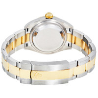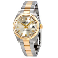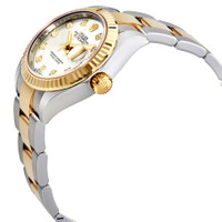 Stainless steel case with a stainless steel Rolex oyster bracelet with 18kt yellow gold center links. Fixed fluted 18kt yellow gold bezel. Silver dial with yellow gold-tone hands and diamond hour markers. Dial Type: Analog. Date display at the 3 o'clock position. Rolex calibre 2236 automatic movement with a 55-hour power reserve. Scratch resistant sapphire crystal. Screw down crown. Solid case back. Case size: 28 mm. Round case shape. Oysterlock clasp. Water resistant at 100 meters / 330 feet. Functions: date, hour, minute, second. Luxury watch style. Watch label: Swiss Made. Rolex Lady-Datejust Silver Diamond Dial Automatic Ladies Watch 279173SDO. INFORMATION Brand: Rolex Series: Lady Datejust Collection Name: Lady Datejust Gender: Womens Model: 279173SDO Watch Label: Swiss Made Movement: Automatic Engine: Rolex Calibre 2236 Power Reserve: 55 hours CASE Case Size: 28 mm Case Color: Silver-Tone Case Material: Stainless Steel Case Shape: Round Case Back: Solid BAND Band Material: Stainless Steel and 18kt Yellow Gold Rolex Oyster Band Type: Bracelet Band Color: Two-tone (Silver-tone and Yellow Gold-tone) Clasp: Oysterlock DIAL Dial Color: Silver Type: Analog Crystal: Scratch Resistant Sapphire Hands: Yellow Gold-tone Dial Markers: Diamond Bezel: Fixed Fluted Bezel Material: 18kt Yellow Gold Crown: Screw Down FEATURES Water Resistance: 100 meters / 330 feet Calendar: Date display at the 3 o'clock position Functions: Date, Hour, Minute, Second Watch Features: Diamond, Stainless Steel, Gold, Analog ADDITIONAL INFO Watch Style: Luxury Warranty: 2 Year Jomashop Warranty UPC Code: 842047112090 Jomashop Sku: RLX279173SDO Item Variation: 279173-72343 Department: Watches Category: Watches