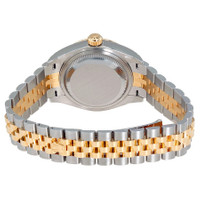 Stainless steel case with a stainless steel bracelet with 18kt yellow gold center links. Fixed 18kt yellow gold bezel. Silver dial with gold-tone hands and diamond hour markers. Diamond-set Roman numeral at the 9 o'clock positions. Dial Type: Analog. Date display at the 3 o'clock position. Rolex calibre 2236 automatic movement with a 55-hour power reserve. Scratch resistant sapphire crystal. Screw down crown. Solid case back. Case size: 28 mm. Round case shape. Water resistant at 100 meters / 330 feet. Functions: date, hour, minute, second. Dress watch style. Watch label: Swiss Made. Rolex Lady-Datejust Silver Diamond Dial Automatic Ladies Watch 279173SDRJ. GENERAL Box Type: Original Box CASE Case Diameter: 28 mm Case Color: Silver-Tone Case Material: Stainless Steel Case Shape: Round Case Back: Solid BAND Band Material: Stainless Steel and 18kt Yellow Gold Band Type: Bracelet Band Color: Two-tone (Silver-tone and Gold-tone) Clasp: Crownclasp DIAL Dial Color: Silver Type: Analog Crystal: Scratch Resistant Sapphire Hands: Gold-tone Dial Markers: Diamond Second Markers: Diamond-set Roman Numeral at the 9 o'clock positions Bezel: Fixed Bezel Material: 18kt Yellow Gold Crown: Screw Down INFORMATION Brand: Rolex Series: Lady-Datejust Collection Name: Lady Datejust Gender: Womens Model: 279173-0003 Watch Label: Swiss Made Movement: Automatic Engine: Rolex Calibre 2236 Power Reserve: 55 hours FEATURES Water Resistance: 100 meters / 330 feet Calendar: Date display at the 3 o'clock position Functions: Date, Hour, Minute, Second Watch Features: Analog, Gold, Stainless Steel, Diamond ADDITIONAL INFO Watch Style: Dress Warranty: 2 Year Jomashop Warranty UPC Code: 842047115084 Jomashop Sku: RLX279173SDRJ Item Variation: 279173SDRJ, M279173-0003 Department: Watches Category: Watches