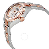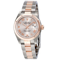 Stainless steel case with a stainless steel Rolex oyster bracelet with 18kt everose gold center links. Fixed fluted 18kt everose gold bezel. Sundust dial with everose gold-tone hands and Roman numeral hour markers. Dial Type: Analog. Date display at the 3 o'clock position. Rolex calibre 2236 automatic movement with a 55-hour power reserve. Scratch resistant sapphire crystal. Screw down crown. Solid case back. Case size: 28 mm. Round case shape. Oysterlock clasp. Water resistant at 100 meters / 330 feet. Functions: date, hour, minute, second, chronometer. Luxury watch style. Watch label: Swiss Made. Rolex Lady Datejust Sundust Dial Steel and 18K Everose Gold Oyster Watch 279171SNRO. INFORMATION Brand: Rolex Series: Lady Datejust Collection Name: Lady Datejust Gender: Womens Model: 279171SNRO Watch Label: Swiss Made Movement: Automatic Engine: Rolex Calibre 2236 Power Reserve: 55 hours CASE Case Size: 28 mm Case Color: Silver-Tone Case Material: Stainless Steel Case Shape: Round Case Back: Solid BAND Band Material: Stainless Steel and 18kt Everose Gold Rolex Oyster Band Type: Bracelet Band Color: Two-tone (Silver-tone and Gold-tone) Clasp: Oysterlock DIAL Dial Color: Sundust Type: Analog Crystal: Scratch Resistant Sapphire Hands: Everose Gold-tone Dial Markers: Roman Numeral Bezel: Fixed Fluted Bezel Material: 18kt Everose Gold Crown: Screw Down FEATURES Water Resistance: 100 meters / 330 feet Calendar: Date display at the 3 o'clock position Functions: Date, Hour, Minute, Second, Chronometer Watch Features: Stainless Steel, Gold, Chronometer, Analog ADDITIONAL INFO Watch Style: Luxury Warranty: 2 Year Jomashop Warranty Jomashop Sku: RLX279171SNRO Department: Watches Category: Watches