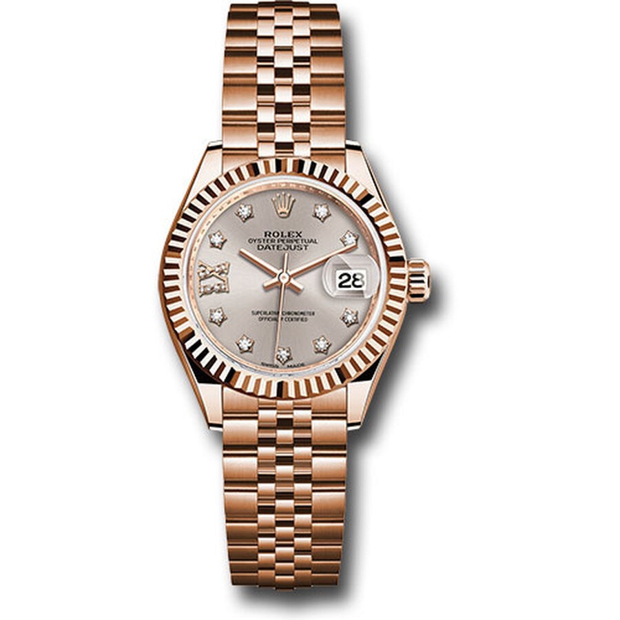 18k everose gold case with a 18k everose gold rolex jubilee bracelet. Fixed, fluted 18k everose gold bezel. Sundust dial with rose gold-tone hands and 9 diamond hour markers. Diamond-filled roman numeral VI. Dial Type: Analog. Date display at the 3 o'clock position. Rolex Calibre 2236 automatic movement with about 55 hours of power reserve. Scratch resistant sapphire crystal. Screw down crown. Case size: 28 mm. Round case shape. Concealed crown clasp. Water resistant at 100 meters / 330 feet. Functions: date, hour, minute, second. Luxury watch style. Watch label: Swiss Made. Rolex Lady Datejust Sundust Diamond Dial 18K Everose Gold Watch 279175SNRDJ. INFORMATION Brand: Rolex Series: Lady Datejust Collection Name: Lady Datejust Gender: Womens Model: 279175SNRDJ Watch Label: Swiss Made Movement: Automatic Engine: Rolex Calibre 2236 Power Reserve: 55 hours CASE Case Size: 28 mm Case Material: 18kt Everose Gold Case Shape: Round BAND Band Material: 18kt Everose Gold Rolex Jubilee Band Type: Bracelet Band Color: Rose Gold-tone Clasp: Concealed Crown DIAL Dial Color: Sundust Type: Analog Crystal: Scratch Resistant Sapphire Hands: Rose Gold-Tone Dial Markers: 9 Diamond Second Markers: Diamond-filled Roman Numeral VI Bezel: Fixed Fluted Bezel Material: 18kt Everose Gold Crown: Screw Down FEATURES Water Resistance: 100 meters / 330 feet Calendar: Date display at the 3 o'clock position Functions: Date, Hour, Minute, Second, Chronometer Watch Features: Diamond, Gold, Chronometer, Analog ADDITIONAL INFO Watch Style: Luxury Warranty: 2 Year Jomashop Warranty Jomashop Sku: RLX279175SNRDJ Department: Watches Category: Watches