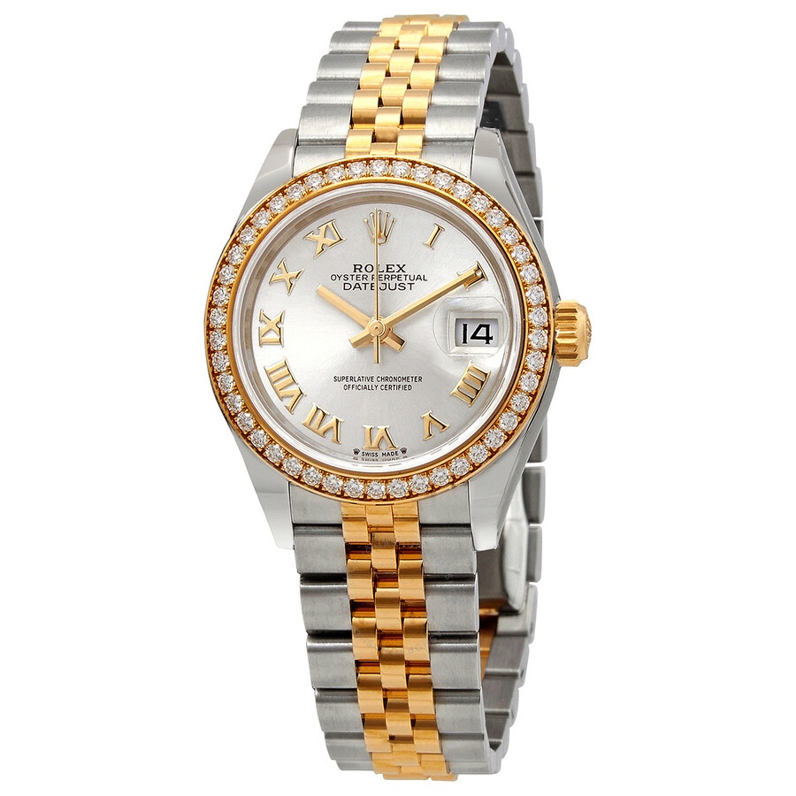 Stainless steel case with a stainless steel Rolex jubilee bracelet with 18kt yellow gold center links. Fixed 18kt yellow gold bezel set with diamonds. Sundust dial with yellow gold-tone hands and Roman numeral hour markers. Dial Type: Analog. Date display at the 3 o'clock position. Rolex calibre 2236 automatic movement, based upon Rolex 2235, containing 31 Jewels, bitting at 28800 vph, and has a power reserve of approximately 55 hours. Scratch resistant sapphire crystal. Screw down crown. Solid case back. Round case shape. Xase size: 28 mm. Concealed crown clasp. Water resistant at 100 meters / 330 feet. Functions: date, hour, minute, second, chronometer. Lady Datejust Series. Luxury watch style. Watch label: Swiss Made. Rolex Lady Datejust Sundust Roman Dial Diamond Bezel Automatic Watch 279383SNRJ. INFORMATION Brand: Rolex Series: Lady Datejust Collection Name: Lady Datejust Gender: Womens Model: 279383SNRJ Watch Label: Swiss Made Movement: Automatic Engine: Rolex Calibre 2236 Power Reserve: 55 hours CASE Case Size: 28 mm Case Material: Stainless Steel Case Shape: Round Case Back: Solid BAND Band Material: Stainless Steel with 18kt Yellow Gold Rolex Jubile Band Type: Bracelet Band Color: Silver-tone Clasp: Concealed Crown DIAL Dial Color: Sundust Type: Analog Crystal: Scratch Resistant Sapphire Hands: Yellow Gold-tone Dial Markers: Roman Numeral Bezel: Fixed Bezel Color: 18kt Yellow Gold Bezel Material: 18kt Yellow Gold set with Diamonds Crown: Screw Down FEATURES Water Resistance: 100 meters / 330 feet Calendar: Date display at the 3 o'clock position Functions: Date, Hour, Minute, Second, Chronometer Watch Features: Diamond, Stainless Steel, Gold, Chronometer, Analog ADDITIONAL INFO Watch Style: Luxury Warranty: 2 Year Jomashop Warranty Jomashop Sku: RLX279383SNRJ Department: Watches Category: Watches