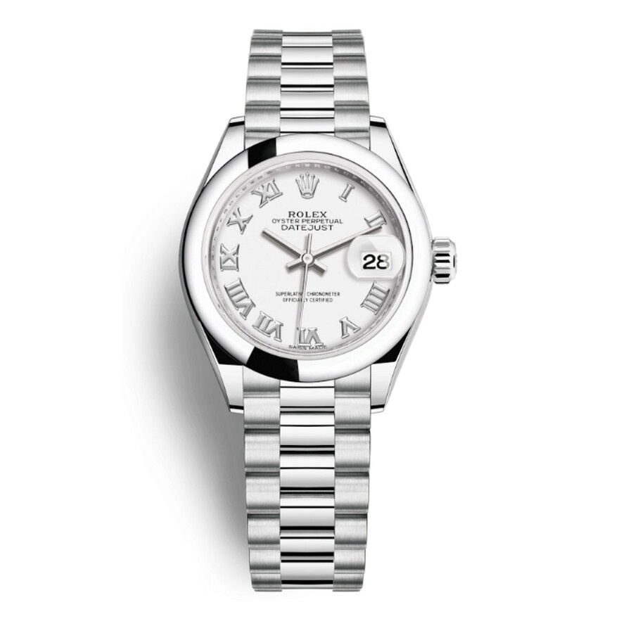 White platinum case with a white platinum rolex president bracelet. Fixed- domed white platinum bezel. White dial with silver-tone hands and Roman numeral hour markers. Dial Type: Analog. Date display at the 3 o'clock position. Rolex Calibre 2236 Automatic movement, based upon Rolex 2235, containing 31 Jewels, bitting at 28800 vph, and has a power reserve of approximately 55 hours. Scratch resistant sapphire crystal. Screw down crown. Solid case back. Round case shape, case size: 28 mm. Crown clasp. Water resistant at 100 meters / 330 feet. Functions: date, hour, minute, second. Lady-datejust Series. Luxury watch style. Watch label: Swiss Made. Rolex Lady-Datejust White Dial Automatic Platinum President Watch 279166WRP. INFORMATION Brand: Rolex Series: Lady Datejust Collection Name: Lady Datejust Gender: Womens Model: 279166WRP Watch Label: Swiss Made Movement: Automatic Engine: Rolex Calibre 2236 Power Reserve: 55 hours CASE Case Size: 28 mm Case Color: White Case Material: Platinum Case Shape: Round Case Back: Solid BAND Band Material: Platinum Rolex President Band Type: Bracelet Band Color: White Clasp: Crownclasp DIAL Dial Color: White Type: Analog Crystal: Scratch Resistant Sapphire Hands: Silver-tone Dial Markers: Roman Numeral Bezel: Fixed- Domed Bezel Color: White Bezel Material: Platinum Crown: Screw Down FEATURES Water Resistance: 100 meters / 330 feet Calendar: Date display at the 3 o'clock position Functions: Date, Hour, Minute, Second Watch Features: Platinum, Analog ADDITIONAL INFO Watch Style: Luxury Warranty: 2 Year Jomashop Warranty Jomashop Sku: RLX279166WRP Department: Watches Category: Watches