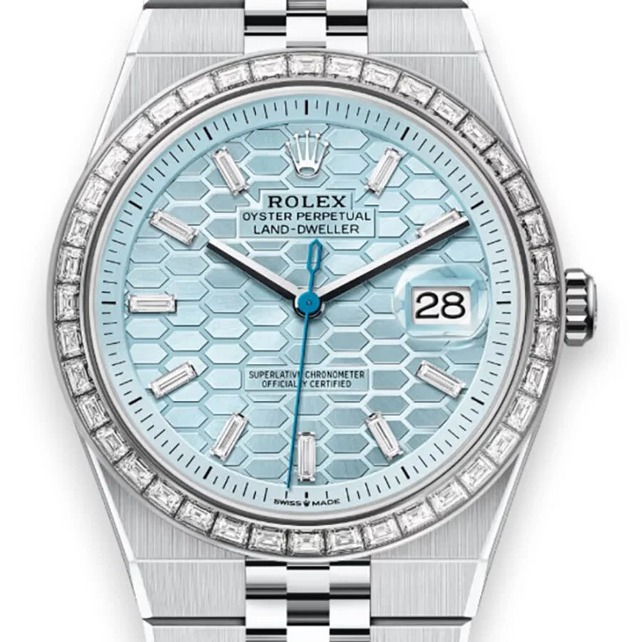 Platinum case with a platinum flat jubilee bracelet. Fixed bezel with diamond set platinum. Ice blue honeycomb motif dial with silver-tone hands and index hour markers. Minute markers around the outer rim. Dial Type: Analog. Date display at the 3 o'clock position. Rolex Calibre 7135 Automatic movement, based upon Rolex Calibre 7140, containing 39 Jewels, bitting at 36000 vph, and has a power reserve of approximately 66 hours. Scratch resistant sapphire crystal. Screw down crown. Transparent see through case back. Round case shape, case size: 40 mm. Fold over clasp with a safety release. Water resistant at 100 meters / 330 feet. Functions: date, hour, minute, second, chronometer. Land Dweller Series. Luxury watch style. Watch label: Swiss Made. Item Variations: 127386TBR-0001. Rolex Land Dweller Automatic Chronometer Diamond Men's Watch M127386TBR-0001. GENERAL Box Type: Original Box CASE Case Diameter: 40 mm Case Material: Platinum Case Shape: Round Case Back: Transparent See Through BAND Band Material: Platinum Flat Jubilee Band Type: Bracelet Clasp: Fold Over with Safety Release DIAL Dial Color: Ice Blue honeycomb motif Type: Analog Crystal: Scratch Resistant Sapphire Hands: Silver-tone Dial Markers: Index Second Markers: Minute Markers around the outer rim Bezel: Fixed Bezel Material: Diamond Set Platinum Crown: Screw Down INFORMATION Brand: Rolex Series: Land Dweller Collection Name: Land Dweller Gender: Mens Model: M127386TBR-0001 Watch Label: Swiss Made Movement: Automatic Engine: Rolex Calibre 7135 Power Reserve: 66 hours FEATURES Water Resistance: 100 meters / 330 feet Calendar: Date display at the 3 o'clock position Functions: Date, Hour, Minute, Second, Chronometer Watch Features: Chronometer, Analog, Platinum, Diamond ADDITIONAL INFO Watch Style: Luxury Warranty: 2 Year Jomashop Warranty Jomashop Sku: RLX127386TBR-0001 Item Variation: 127386TBR-0001 Department: Watches