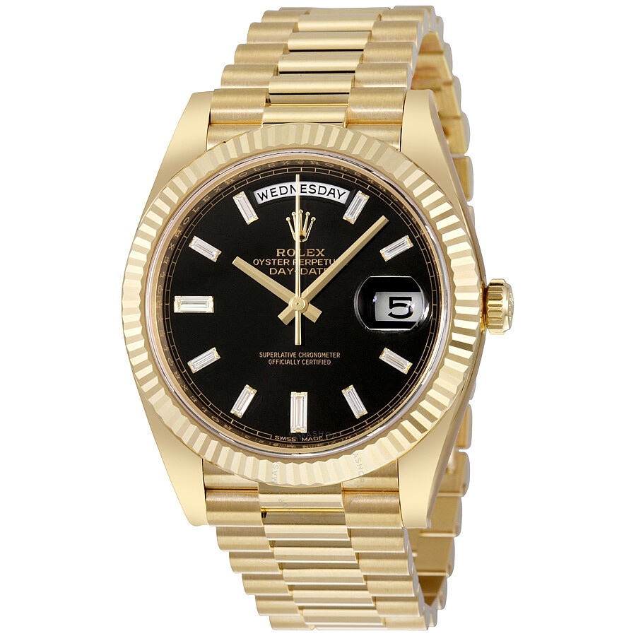18kt yellow gold case with a 18kt yellow gold Rolex president bracelet. Fixed fluted 18kt yellow gold bezel. Black dial with gold-tone hands and diamond hour markers. Minute markers around the outer rim. Dial Type: Analog. Date display at the 3 o'clock position. Day of the week display centered on the 12 o'clock position. Automatic movement with a 70-hour power reserve. Scratch resistant sapphire crystal. Screw down crown. Solid case back. Case size: 40 mm. Round case shape. Concealed crown clasp. Water resistant at 100 meters / 330 feet. Functions: date, day, hour, minute, second. Luxury watch style. Watch label: Swiss Made. Rolex Oyster Perpetual 18K Yellow Gold Diamond Men's Automatic President Watch 228238BKDP. CASE Case Size: 40 Case Material: 18kt Yellow Gold Case Shape: Round Case Back: Solid BAND Band Material: 18kt Yellow Gold Rolex President Band Type: Bracelet Band Color: Yellow Gold-tone Clasp: Concealed Crown DIAL Dial Color: Black Type: Analog Crystal: Scratch Resistant Sapphire Hands: Gold-tone Dial Markers: Diamond Second Markers: Minute Markers around the outer rim Bezel: Fixed Fluted Bezel Material: 18kt Yellow Gold Crown: Screw Down INFORMATION Brand: Rolex Series: Day-Date 40 Collection Name: Day-Date 40 Gender: Mens Model: 228238-0004 Watch Label: Swiss Made Movement: Automatic Engine: Rolex Calibre 3255 Power Reserve: 70 hours FEATURES Water Resistance: 100 meters / 330 feet Calendar: Date display at the 3 o'clock position. Day of the Week display centered on the 12 o'clock position. Functions: Date, Day, Hour, Minute, Second, Chronometer Watch Features: Diamond, Gold, Perpetual, Chronometer, Analog ADDITIONAL INFO Watch Style: Luxury Warranty: 2 Year Jomashop Warranty UPC Code: 845960098168 Jomashop Sku: RLX228238BKDP Item Variation: 228238-83418, M228238-0004, 228238BKDP Department: Watches Category: Watches