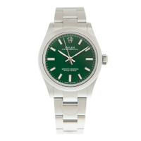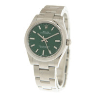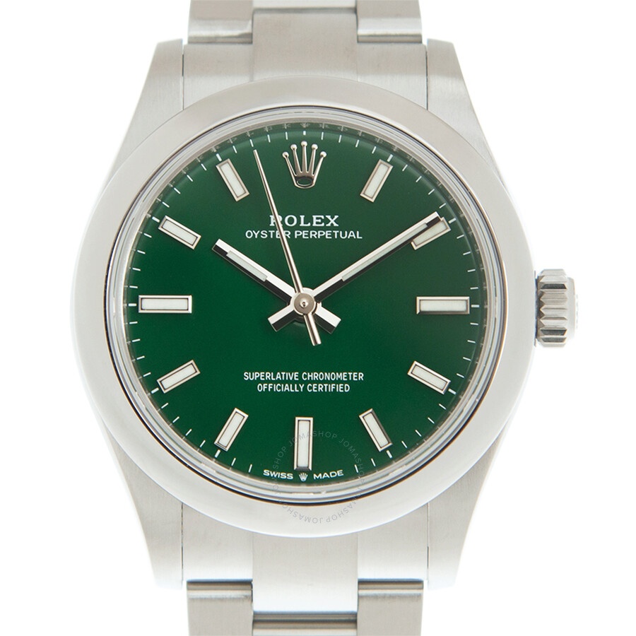 Silver-tone stainless steel case and bracelet. Fixed silver-tone stainless steel bezel. Green dial with silver-tone hands and index hour markers. Minute markers around the outer rim. Dial Type: Analog. Luminescent hands and markers. Rolex Calibre 2232 Automatic movement, containing 31 Jewels, bitting at 28800 vph, and has a power reserve of approximately 55 hours. Scratch resistant sapphire crystal. Screw down crown. Solid case back. Round case shape, case size: 31 mm. Oysterlock clasp. Water resistant at 100 meters / 330 feet. Functions: hour, minute, second, chronometer. Oyster Perpetual 31 Series. Sport watch style. Watch label: Swiss Made. Item Variations: M277200-0006. Rolex Oyster Perpetual 31 Automatic Green Dial Ladies Watch 277200GNSO. CASE Case Size: 31 Case Material: Stainless Steel Case Shape: Round Case Back: Solid BAND Band Material: Stainless Steel Oyster Band Type: Bracelet Band Color: Silver-tone Clasp: Oysterlock DIAL Dial Color: Green Type: Analog Crystal: Scratch Resistant Sapphire Hands: Silver-tone Dial Markers: Index Second Markers: Minute Markers around the outer rim Luminiscence: Hands and Markers Bezel: Fixed Bezel Color: Silver-tone Bezel Material: Stainless Steel Crown: Screw Down INFORMATION Brand: Rolex Series: Oyster Perpetual Collection Name: Oyster Perpetual Gender: Womens Model: M277200-0006 Watch Label: Swiss Made Movement: Automatic Engine: Rolex Calibre 2232 Power Reserve: 55 hours FEATURES Water Resistance: 100 meters / 330 feet Functions: Hour, Minute, Second, Chronometer Watch Features: Stainless Steel, Perpetual, Chronometer, Analog ADDITIONAL INFO Watch Style: Sport Warranty: 2 Year Jomashop Warranty Jomashop Sku: RLX277200GNSO Item Variation: 277200-0006, 277200GNSO Department: Watches Category: Watches