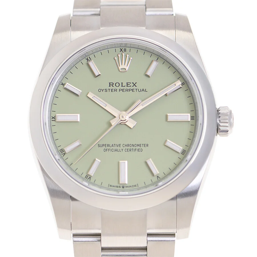 Silver-tone stainless steel case with a silver-tone stainless steel oyster bracelet. Fixed silver-tone stainless steel bezel. Green dial with silver-tone hands and index hour markers. Minute markers around the outer rim. Dial Type: Analog. Luminescent hands and markers. Rolex Calibre 2232 Automatic movement, containing 31 Jewels, bitting at 28800 vph, and has a power reserve of approximately 55 hours. Scratch resistant sapphire crystal. Screw down crown. Solid case back. Round case shape, case size: 34 mm. Fold over clasp with a safety release. Water resistant at 100 meters / 330 feet. Functions: hour, minute, second, chronometer. Oyster Perpetual Series. Luxury watch style. Watch label: Swiss Made. Item Variations: 124200-0006. Rolex Oyster Perpetual Automatic Chronometer Green Dial Ladies Watch M124200-0006. GENERAL Box Type: Original Box CASE Case Diameter: 34 mm Case Material: Stainless Steel Case Shape: Round Case Back: Solid BAND Band Material: Stainless Steel Oyster Band Type: Bracelet Band Color: Silver-tone Clasp: Fold Over with Safety Release DIAL Dial Color: Green Type: Analog Crystal: Scratch Resistant Sapphire Hands: Silver-tone Dial Markers: Index Second Markers: Minute Markers around the outer rim Luminiscence: Hands and Markers Bezel: Fixed Bezel Color: Silver-tone Bezel Material: Stainless Steel Crown: Screw Down INFORMATION Brand: Rolex Series: Oyster Perpetual Collection Name: Oyster Perpetual Gender: Womens Model: M124200-0006 Watch Label: Swiss Made Movement: Automatic Engine: Rolex Calibre 2232 Power Reserve: 55 hours FEATURES Water Resistance: 100 meters / 330 feet Functions: Hour, Minute, Second, Chronometer Watch Features: Analog, Chronometer, Perpetual, Stainless Steel ADDITIONAL INFO Watch Style: Luxury Warranty: 2 Year Jomashop Warranty Jomashop Sku: RLX124200-0006 Item Variation: 124200-0006 Department: Watches