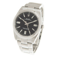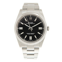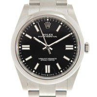 Stainless steel case with a stainless steel bracelet. Fixed stainless steel bezel. Black dial with luminous silver-tone hands and index hour markers. Minute markers around the outer rim. Dial Type: Analog. Luminescent hands and markers. Rolex calibre 3230 automatic movement, containing 31 Jewels, bitting at 28800 vph, and has a power reserve of approximately 70 hours. Scratch resistant sapphire crystal. Screw down crown. Solid case back. Round case shape. Case size: 41 mm. Oysterlock clasp. Water resistant at 100 meters / 330 feet. Functions: hour, minute, second, chronometer. Oyster Perpetual 41 Series. Sport watch style. Watch label: Swiss Made. Item Variations: M124300-0002. Rolex Oyster Perpetual 41 Automatic Black Dial Men's Watch 124300BKSO. CASE Case Size: 41 Case Material: Stainless Steel Case Shape: Round Case Back: Solid BAND Band Material: Stainless Steel Band Type: Bracelet Band Color: Silver-tone Clasp: Oysterlock DIAL Dial Color: Black Type: Analog Crystal: Scratch Resistant Sapphire Hands: Luminous Silver-tone Dial Markers: Index Second Markers: Minute Markers around the outer rim Luminiscence: Hands and Markers Bezel: Fixed Bezel Color: Silver-tone Bezel Material: Stainless Steel Crown: Screw Down INFORMATION Brand: Rolex Series: Oyster Perpetual Collection Name: Oyster Perpetual Gender: Mens Model: M124300-0002 Watch Label: Swiss Made Movement: Automatic Engine: Rolex Calibre 3230 Power Reserve: 70 hours FEATURES Water Resistance: 100 meters / 330 feet Functions: Hour, Minute, Second, Chronometer Watch Features: Stainless Steel, Perpetual, Chronometer, Analog ADDITIONAL INFO Watch Style: Sport Warranty: 2 Year Jomashop Warranty Jomashop Sku: RLX124300BKSO Item Variation: 124300BKSO, 124300-0002 Department: Watches Category: Watches