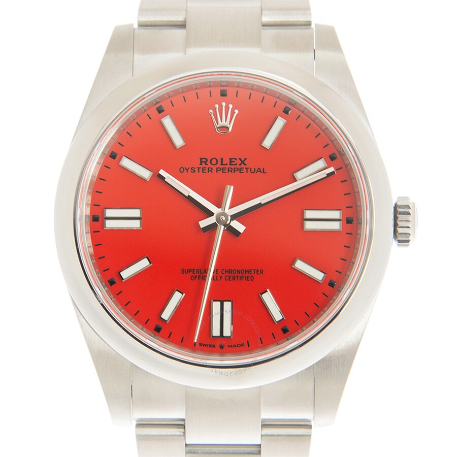 Stainless steel case with a stainless steel bracelet. Fixed stainless steel bezel. Coral red dial with luminous silver-tone hands and index hour markers. Minute markers around the outer rim. Dial Type: Analog. Luminescent hands and markers. Rolex calibre 3230 automatic movement, containing 31 Jewels, bitting at 28800 vph, and has a power reserve of approximately 70 hours. Scratch resistant sapphire crystal. Screw down crown. Solid case back. Round case shape. Case size: 41 mm. Oysterlock clasp. Water resistant at 100 meters / 330 feet. Functions: hour, minute, second, chronometer. Oyster Perpetual 41 Series. Sport watch style. Watch label: Swiss Made. Item Variations: M124300-0007. Rolex Oyster Perpetual 41 Automatic Coral Red Dial Men's Watch 124300CRLRDSO. CASE Case Size: 41 Case Material: Stainless Steel Case Shape: Round Case Back: Solid BAND Band Material: Stainless Steel Band Type: Bracelet Band Color: Silver-tone Clasp: Oysterlock DIAL Dial Color: Coral Red Type: Analog Crystal: Scratch Resistant Sapphire Hands: Luminous Silver-tone Dial Markers: Index Second Markers: Minute Markers around the outer rim Luminiscence: Hands and Markers Bezel: Fixed Bezel Color: Silver-tone Bezel Material: Stainless Steel Crown: Screw Down INFORMATION Brand: Rolex Series: Oyster Perpetual Collection Name: Oyster Perpetual Gender: Mens Model: 124300CRLRDSO Watch Label: Swiss Made Movement: Automatic Engine: Rolex Calibre 3230 Power Reserve: 70 hours FEATURES Water Resistance: 100 meters / 330 feet Functions: Hour, Minute, Second, Chronometer Watch Features: Stainless Steel, Perpetual, Chronometer, Analog ADDITIONAL INFO Watch Style: Sport Warranty: 2 Year Jomashop Warranty Jomashop Sku: RLX124300CRLRDSO Item Variation: M124300-0007 Department: Watches Category: Watches