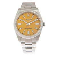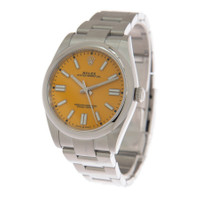 Stainless steel case and bracelet. Fixed stainless steel bezel. Yellow dial with index hour markers. Dial Type: Analog. Rolex Calibre 3230 Automatic movement, containing 31 Jewels, bitting at 28800 vph, and has a power reserve of approximately 70 hours. Scratch resistant sapphire crystal. Screw down crown. Solid case back. Round case shape, case size: 41 mm. Oysterlock clasp. Water resistant at 100 meters / 330 feet. Functions: hour, minute, second, chronometer. Oyster Perpetual 41 Series. Sport watch style. Watch label: Swiss Made. Item Variations: M124300-0004. Rolex Oyster Perpetual 41 Automatic Yellow Dial Men's Watch 124300SSO. CASE Case Size: 41 Case Material: Stainless Steel Case Shape: Round Case Back: Solid BAND Band Material: Stainless Steel Oyster Band Type: Bracelet Band Color: Silver-tone Clasp: Oysterlock DIAL Dial Color: Yellow Type: Analog Crystal: Scratch Resistant Sapphire Hands: Silver-tone Dial Markers: Index Second Markers: Minute Markers around the outer rim Luminiscence: Hands and Markers Bezel: Fixed Bezel Color: Silver-tone Bezel Material: Stainless Steel Crown: Screw Down INFORMATION Brand: Rolex Series: Oyster Perpetual Collection Name: Oyster Perpetual Gender: Mens Model: 124300YLSO Watch Label: Swiss Made Movement: Automatic Engine: Rolex Calibre 3230 Power Reserve: 70 hours FEATURES Water Resistance: 100 meters / 330 feet Functions: Hour, Minute, Second, Chronometer Watch Features: Stainless Steel, Perpetual, Chronometer, Analog ADDITIONAL INFO Watch Style: Sport Warranty: 2 Year Jomashop Warranty Jomashop Sku: RLX124300YLSO Item Variation: M124300-0004 Department: Watches Category: Watches