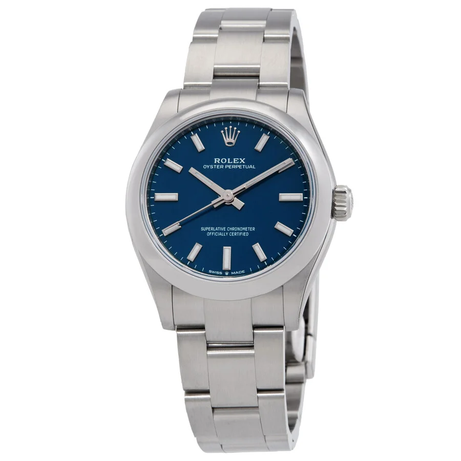 Silver-tone stainless steel case with a silver-tone stainless steel oyster bracelet. Fixed silver-tone stainless steel bezel. Blue dial with silver-tone hands and index hour markers. Minute markers around the outer rim. Dial Type: Analog. Luminescent hands and markers. Rolex Calibre 2232 Automatic movement, containing 31 Jewels, bitting at 28800 vph, and has a power reserve of approximately 55 hours. Scratch resistant sapphire crystal. Screw down crown. Solid case back. Round case shape, case size: 31 mm. Fold over clasp with a safety release. Water resistant at 100 meters / 330 feet. Functions: hour, minute, second, chronometer. Oyster Perpetual Series. Luxury watch style. Watch label: Swiss Made. Item Variations: 277200-0017. Rolex Oyster Perpetual Automatic Chronometer Blue Dial Ladies Watch M277200-0017. GENERAL Box Type: Original Box CASE Case Diameter: 31 mm Case Material: Stainless Steel Case Shape: Round Case Back: Solid BAND Band Material: Stainless Steel Oyster Band Type: Bracelet Band Color: Silver-tone Clasp: Fold Over with Safety Release DIAL Dial Color: Blue Type: Analog Crystal: Scratch Resistant Sapphire Hands: Silver-tone Dial Markers: Index Second Markers: Minute Markers around the outer rim Luminiscence: Hands and Markers Bezel: Fixed Bezel Color: Silver-tone Bezel Material: Stainless Steel Crown: Screw Down INFORMATION Brand: Rolex Series: Oyster Perpetual Collection Name: Oyster Perpetual Gender: Womens Model: M277200-0017 Watch Label: Swiss Made Movement: Automatic Engine: Rolex Calibre 2232 Power Reserve: 55 hours FEATURES Water Resistance: 100 meters / 330 feet Functions: Hour, Minute, Second, Chronometer Watch Features: Analog, Chronometer, Perpetual, Stainless Steel ADDITIONAL INFO Watch Style: Luxury Warranty: 2 Year Jomashop Warranty Jomashop Sku: RLX277200-0017 Item Variation: 277200-0017 Department: Watches