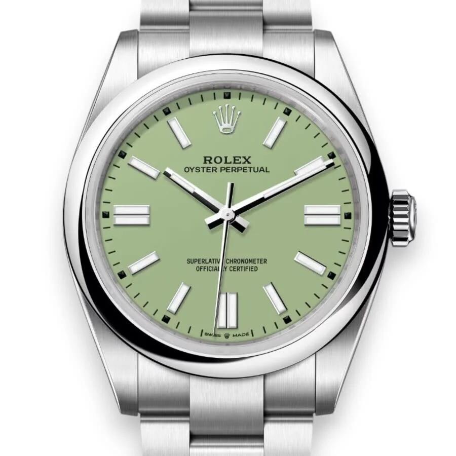 Silver-tone stainless steel case with a silver-tone stainless steel oyster bracelet. Fixed silver-tone stainless steel bezel. Green dial with silver-tone hands and index hour markers. Minute markers around the outer rim. Dial Type: Analog. Luminescent hands and markers. Rolex Calibre 3230 Automatic movement, containing 31 Jewels, bitting at 28800 vph, and has a power reserve of approximately 70 hours. Scratch resistant sapphire crystal. Screw down crown. Solid case back. Round case shape, case size: 41 mm. Fold over clasp with a safety release. Water resistant at 100 meters / 330 feet. Functions: hour, minute, second, chronometer. Oyster Perpetual Series. Luxury watch style. Watch label: Swiss Made. Item Variations: 134300-0006. Rolex Oyster Perpetual Automatic Chronometer Green Dial Men's Watch M134300-0006. GENERAL Box Type: Original Box CASE Case Diameter: 41 mm Case Material: Stainless Steel Case Shape: Round Case Back: Solid BAND Band Material: Stainless Steel Oyster Band Type: Bracelet Band Color: Silver-tone Clasp: Fold Over with Safety Release DIAL Dial Color: Green Type: Analog Crystal: Scratch Resistant Sapphire Hands: Silver-tone Dial Markers: Index Second Markers: Minute Markers around the outer rim Luminiscence: Hands and Markers Bezel: Fixed Bezel Color: Silver-tone Bezel Material: Stainless Steel Crown: Screw Down INFORMATION Brand: Rolex Series: Oyster Perpetual Collection Name: Oyster Perpetual Gender: Mens Model: M134300-0006 Watch Label: Swiss Made Movement: Automatic Engine: Rolex Calibre 3230 Power Reserve: 70 hours FEATURES Water Resistance: 100 meters / 330 feet Functions: Hour, Minute, Second, Chronometer Watch Features: Analog, Chronometer, Perpetual, Stainless Steel ADDITIONAL INFO Watch Style: Luxury Warranty: 2 Year Jomashop Warranty Jomashop Sku: RLX134300-0006 Item Variation: 134300-0006 Department: Watches