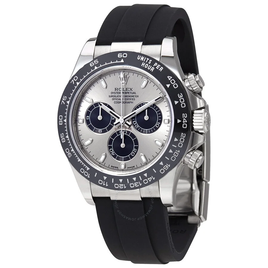 18kt white gold case with a black Rolex oysterflex strap. Fixed 18kt white gold bezel with a black cerachrom top ring. Steel dial with luminous silver-tone hands and index hour markers. Minute markers around the outer rim. Dial Type: Analog. Luminescent hands and markers. Chronograph - three sub-dials displaying: 60 second, 30 minute and 12 hours. Rolex calibre 4130 automatic movement with a 72-hour power reserve. Scratch resistant sapphire crystal. Screw down crown. Solid case back. Round case shape. Case size: 40 mm. Oysterlock clasp. Water resistant at 100 meters / 330 feet. Functions: chronograph, tachymeter, hour, minute, second. Luxury watch style. Watch label: Swiss Made. Rolex Oyster Perpetual Cosmograph Daytona 18K White Gold Men's Chronograph Watch 116519LN. CASE Case Size: 40 Case Material: 18kt White Gold Case Shape: Round Case Back: Solid BAND Band Material: Rolex Oysterflex Band Type: Strap Band Color: Black Clasp: Oysterlock DIAL Dial Color: Steel Type: Analog Crystal: Scratch Resistant Sapphire Hands: Luminous Silver-tone Dial Markers: Index Second Markers: Minute Markers around the outer rim Sub Dials: Three - 60 Second, 30 Minute and 12 Hour Luminiscence: Hands and Markers Bezel: Fixed Bezel Color: Black Bezel Material: Cerachrom Crown: Screw Down INFORMATION Brand: Rolex Series: Oyster Perpetual Collection Name: Oyster Perpetual Gender: Mens Model: 116519LN Watch Label: Swiss Made Movement: Automatic Engine: Rolex Calibre 4130 Power Reserve: 72 hours FEATURES Water Resistance: 100 meters / 330 feet Functions: Chronograph, Tachymeter, Hour, Minute, Second Watch Features: Chronograph, Gold, Perpetual, Analog ADDITIONAL INFO Watch Style: Luxury Warranty: 2 Year Jomashop Warranty Jomashop Sku: RLX116519LN Item Variation: M116519LN-0024 Department: Watches Category: Watches