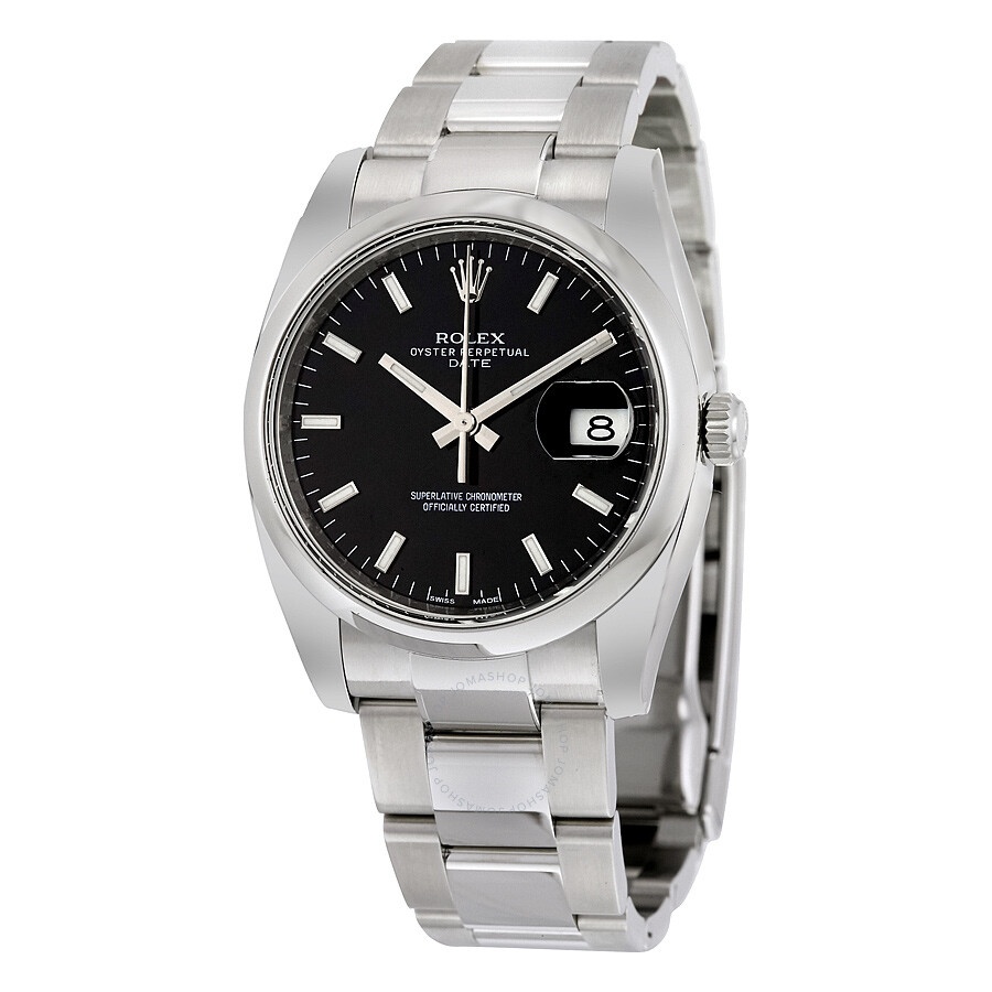 Stainless steel case with a stainless steel Rolex oyster bracelet. Fixed smooth stainless steel bezel. Black dial with luminous silver-tone hands and index hour markers. Minute markers around the outer rim. Dial Type: Analog. Luminescent hands and dial markers. Date display at the 3 o'clock position. Rolex calibre 3135 automatic movement, containing 31 Jewels, bitting at 28800 vph, and has a power reserve of approximately 48 hours. Scratch resistant sapphire crystal. Screw down crown. Solid case back. Round case shape. Case size: 34 mm. Oysterlock clasp. Water resistant at 100 meters / 330 feet. Functions: date, hour, minute, second, chronometer. Oyster Perpetual Date 34 Series. Luxury watch style. Watch label: Swiss Made. Item Variations: 115200-72190. Rolex Oyster Perpetual Date 34 Black Dial Stainless Steel Bracelet Automatic Men's Watch 115200BKSO. GENERAL Color: Black CASE Case Size: 34 Case Color: Silver-Tone Case Material: Stainless Steel Case Shape: Round Case Back: Solid BAND Band Material: Stainless Steel Rolex Oyster Band Type: Bracelet Band Color: Silver-tone Clasp: Oysterlock DIAL Dial Color: Black Type: Analog Crystal: Scratch Resistant Sapphire Hands: Luminous Silver-tone Dial Markers: Index Second Markers: Minute Markers Around The Outer Rim Luminiscence: Hands and Dial Markers Bezel: Fixed Smooth Bezel Color: Silver-tone Bezel Material: Stainless Steel Crown: Screw Down INFORMATION Brand: Rolex Series: Oyster Perpetual Collection Name: Oyster Perpetual Gender: Mens Model: 115200BKSO Watch Label: Swiss Made Movement: Automatic Engine: Rolex Calibre 3135 Power Reserve: 48 hours FEATURES Water Resistance: 100 meters / 330 feet Calendar: Date display at the 3 o'clock position Functions: Date, Hour, Minute, Second, Chronometer Watch Features: Stainless Steel, Perpetual, Chronometer, Analog ADDITIONAL INFO Watch Style: Luxury Warranty: 2 Year Jomashop Warranty UPC Code: 845960082617 Jomashop Sku: RLX115200BKSO Item Variation: 115200-72190 Department: Watches Category: Watches
