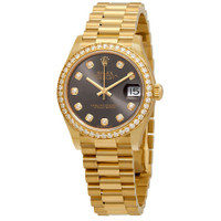 18kt yellow gold case with a 18kt yellow gold bracelet. Fixed 18kt yellow gold bezel set with diamonds. Yellow gold hands and diamond hour markers. Dial Type: Analog. Date display at the 3 o'clock position. Rolex calibre 2236 automatic movement, based upon Rolex 2235, containing 31 Jewels, bitting at 28800 vph, and has a power reserve of approximately 55 hours. Scratch resistant sapphire crystal. Screw down crown. Solid case back. Round case shape. Case size: 31 mm. Concealed fold over crown clasp. Water resistant at 100 meters / 330 feet. Functions: date, hour, minute, second, chronometer. Oyster Perpetual Datejust 31 Series. Luxury watch style. Watch label: Swiss Made. Rolex Oyster Perpetual Datejust 31 Automatic Chronometer Diamond Ladies Watch 278288RDP. INFORMATION Brand: Rolex Series: Oyster Perpetual Collection Name: Oyster Perpetual Gender: Womens Model: 278288RDP Watch Label: Swiss Made Movement: Automatic Engine: Rolex Calibre 2236 Power Reserve: 55 hours CASE Case Size: 31 mm Case Material: 18kt Yellow Gold Case Shape: Round Case Back: Solid BAND Band Material: 18kt Yellow Gold Band Type: Bracelet Clasp: Concealed Fold Over Crown DIAL Dial Color: Grey Type: Analog Crystal: Scratch Resistant Sapphire Hands: Yellow Gold Dial Markers: Diamond Bezel: Fixed Bezel Color: 18kt Yellow Gold Bezel Material: 18kt Yellow Gold set with Diamonds Crown: Screw Down FEATURES Water Resistance: 100 meters / 330 feet Calendar: Date display at the 3 o'clock position Functions: Date, Hour, Minute, Second, Chronometer Watch Features: Diamond, Gold, Perpetual, Chronometer, Analog ADDITIONAL INFO Watch Style: Luxury Warranty: 2 Year Jomashop Warranty Jomashop Sku: RLX278288RDP Department: Watches Category: Watches