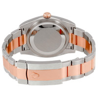 Stainless steel case with a stainless steel Rolex oyster bracelet with 18kt everose gold center links. Fixed fluted 18kt everose gold bezel. Black dial with rose gold-tone hands and diamond hour markers. Dial Type: Analog. Date display at the 3 o'clock position. Rolex calibre 3135 automatic movement with a 50-hour power reserve. Scratch resistant sapphire crystal. Screw down crown. Solid case back. Case size: 36 mm. Round case shape. Oysterlock clasp. Water resistant at 100 meters / 330 feet. Functions: date, hour, minute, second. Luxury watch style. Watch label: Swiss Made. Rolex Oyster Perpetual Datejust 36 Black Dial Stainless Steel and 18K Everose Gold Rolex Oyster Automatic Men's Watch 116231BKDO. GENERAL Color: Black / Gold / Pink CASE Case Size: 36 Case Color: Silver-Tone Case Material: Stainless Steel Case Shape: Round Case Back: Solid BAND Band Material: Stainless Steel and 18kt Everose Gold Rolex Oyster Band Type: Bracelet Band Color: Two-tone (Silver-tone and Gold-tone) Clasp: Oysterlock DIAL Dial Color: Black Type: Analog Crystal: Scratch Resistant Sapphire Hands: Rose Gold-tone Dial Markers: Diamond Bezel: Fixed Fluted Bezel Material: 18kt Everose Gold Crown: Screw Down INFORMATION Brand: Rolex Series: Oyster Perpetual Collection Name: Oyster Perpetual Gender: Mens Model: 116231BKDO Watch Label: Swiss Made Movement: Automatic Engine: Rolex Calibre 3135 Power Reserve: 50 hours FEATURES Water Resistance: 100 meters / 330 feet Calendar: Date display at the 3 o'clock position Functions: Date, Hour, Minute, Second, Chronometer Watch Features: Analog, Chronometer, Perpetual, Gold, Stainless Steel, Diamond ADDITIONAL INFO Watch Style: Luxury Warranty: 2 Year Jomashop Warranty UPC Code: 845960074551 Jomashop Sku: RLX116231BKDO Department: Watches Category: Watches