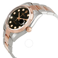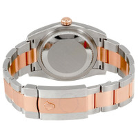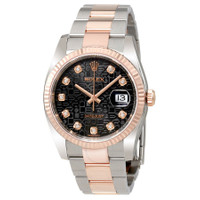 Stainless steel case with a stainless steel Rolex oyster bracelet with 18kt everose gold center links. Fixed fluted 18kt everose gold bezel. Black jubilee dial with rose gold-tone hands and diamond hour markers. Dial Type: Analog. Date display at the 3 o'clock position. Rolex Calibre 3135 automatic movement with a 50-hour power reserve. Scratch resistant sapphire crystal. Screw down crown. Solid case back. Case size: 36 mm. Round case shape. Oysterlock clasp. Water resistant at 100 meters / 330 feet. Functions: date, hour, minute, second. Luxury watch style. Watch label: Swiss Made. Rolex Oyster Perpetual Datejust 36 Black Jubilee Dial Stainless Steel and 18K Everose Gold Rolex Oyster Automatic Men's Watch 116231BKJDO. GENERAL Color: Black / Gold / Pink CASE Case Size: 36 Case Color: Silver-Tone Case Material: Stainless Steel Case Shape: Round Case Back: Solid BAND Band Material: Stainless Steel and 18kt Everose Gold Rolex Oyster Band Type: Bracelet Band Color: Two-tone (Silver-tone and Gold-tone) Clasp: Oysterlock DIAL Dial Color: Black Jubilee Type: Analog Crystal: Scratch Resistant Sapphire Hands: Rose Gold-tone Dial Markers: Diamond Bezel: Fixed Fluted Bezel Material: 18kt Everose Gold Crown: Screw Down INFORMATION Brand: Rolex Series: Oyster Perpetual Collection Name: Oyster Perpetual Gender: Mens Model: 116231BKJDO Watch Label: Swiss Made Movement: Automatic Engine: Rolex Calibre 3135 Power Reserve: 50 hours FEATURES Water Resistance: 100 meters / 330 feet Calendar: Date display at the 3 o'clock position Functions: Date, Hour, Minute, Second, Chronometer Watch Features: Analog, Chronometer, Perpetual, Gold, Stainless Steel, Diamond ADDITIONAL INFO Watch Style: Luxury Warranty: 2 Year Jomashop Warranty UPC Code: 845960074575 Jomashop Sku: RLX116231BKJDO Department: Watches Category: Watches