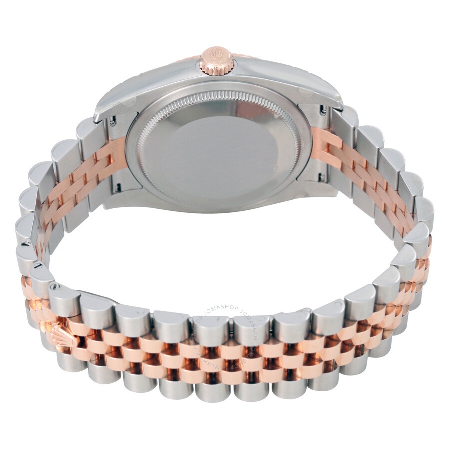 Stainless steel case with a stainless steel Rolex jubilee bracelet with 18kt everose gold center links. Fixed fluted 18kt everose gold bezel. Black dial with luminous rose gold hands and index hour markers. Minute markers around the outer rim. Dial Type: Analog. Luminescent hands and markers. Date display at the 3 o'clock position. Automatic movement with a 50-hour power reserve. Scratch resistant sapphire crystal. Screw down crown. Solid case back. Case size: 36 mm. Round case shape. Deployment clasp. Water resistant at 100 meters / 330 feet. Functions: date, hour, minute, second. Luxury watch style. Watch label: Swiss Made. Rolex Oyster Perpetual Datejust 36 Black Dial Stainless Steel and 18K Everose Gold Rolex Jubilee Automatic Men's Watch 116231BKSJ. GENERAL Color: Black / Gold / Rose CASE Case Size: 36 Case Color: Silver-Tone Case Material: Stainless Steel Case Shape: Round Case Back: Solid BAND Band Material: Stainless Steel and 18kt Everose Gold Rolex Jubile Band Type: Bracelet Band Color: Two-tone (Silver-tone and Rose Gold-tone) Clasp: Deployment DIAL Dial Color: Black Type: Analog Crystal: Scratch Resistant Sapphire Hands: Luminous Rose Gold Dial Markers: Index Second Markers: Minute Markers around the outer rim Luminiscence: Hands and Markers Bezel: Fixed Fluted Bezel Material: 18kt Everose Gold Crown: Screw Down INFORMATION Brand: Rolex Series: Oyster Perpetual Collection Name: Oyster Perpetual Gender: Mens Model: 116231BKSJ Watch Label: Swiss Made Movement: Automatic Engine: Rolex Calibre 3135 Power Reserve: 50 hours FEATURES Water Resistance: 100 meters / 330 feet Calendar: Date display at the 3 o'clock position Functions: Date, Hour, Minute, Second, Chronometer Watch Features: Stainless Steel, Gold, Perpetual, Chronometer, Analog ADDITIONAL INFO Watch Style: Luxury Warranty: 2 Year Jomashop Warranty UPC Code: 845960055093 Jomashop Sku: RLX116231BKSJ Item Variation: 116231-63601 Department: Watches Category: Watches