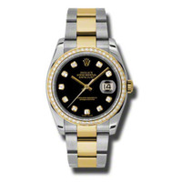 Stainless steel and 18k yellow gold case with a stainless steel and 18k yellow gold rolex oyster bracelet. Fixed - 18k yellow gold diamond-set bezel. Black dial with yellow gold-tone hands and diamond hour markers. Dial Type: Analog. Date display at the 3 o'clock position. Automatic movement. Scratch resistant sapphire crystal. Screw down crown. Case diameter: 36 mm. Round case shape. Oysterclasp clasp. Water resistant at 100 meters / 330 feet. Functions: date, hour, minute, second. Luxury watch style. Watch label: Swiss Made. Rolex Oyster Perpetual Datejust 36 Black Dial Stainless Steel and 18K Yellow Gold Rolex Oyster Automatic Ladies Watch 116243BKDO. GENERAL Color: Black / Gold / Yellow INFORMATION Brand: Rolex Series: Oyster Perpetual Collection Name: Oyster Perpetual Gender: Womens Model: 116243BKDO Watch Label: Swiss Made Movement: Automatic Engine: Rolex Calibre 3135 Power Reserve: 50 hours CASE Case Size: 36 mm Case Material: Stainless Steel and 18kt Yellow Gold Case Shape: Round Case Back: Solid BAND Band Material: Stainless Steel and 18kt Yellow Gold Rolex Oyster Band Type: Bracelet Band Color: Two-tone (Silver-tone and Yellow Gold-tone) Clasp: Oysterlock DIAL Dial Color: Black Type: Analog Crystal: Scratch Resistant Sapphire Hands: Yellow Gold-Tone Dial Markers: Diamond Bezel: Fixed Bezel Color: 18K Yellow Gold Bezel Material: Diamond Set Crown: Screw Down FEATURES Water Resistance: 100 meters / 330 feet Calendar: Date display at the 3 o'clock position Functions: Date, Hour, Minute, Second, Chronometer Watch Features: Analog, Chronometer, Perpetual, Gold, Stainless Steel, Diamond ADDITIONAL INFO Watch Style: Luxury Warranty: 2 Year Jomashop Warranty UPC Code: 845960075251 Jomashop Sku: RLX116243BKDO Department: Watches Category: Watches