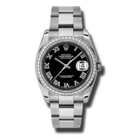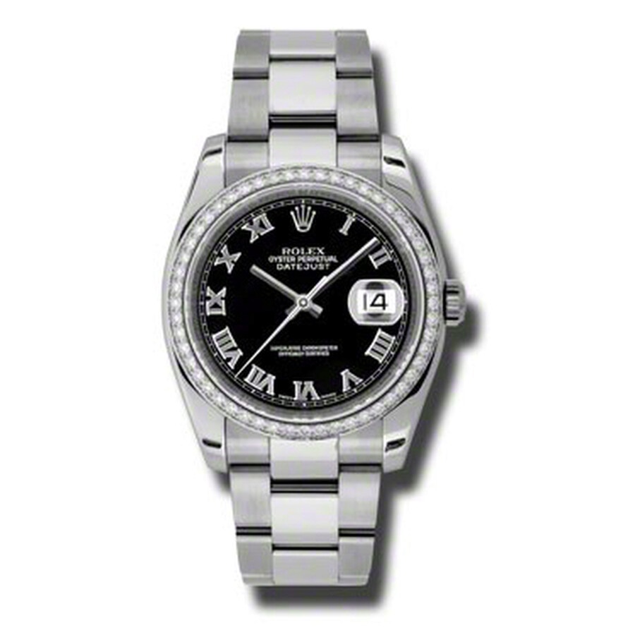 Stainless steel case with a stainless steel rolex oyster bracelet. Fixed - 18k white gold diamond-set bezel. Black dial with silver-tone hands and Roman numeral hour markers. Dial Type: Analog. Date display at the 3 o'clock position. Automatic movement. Scratch resistant sapphire crystal. Screw down crown. Case diameter: 36 mm. Round case shape. Oysterclasp clasp. Water resistant at 100 meters / 330 feet. Functions: date, hour, minute, second. Luxury watch style. Watch label: Swiss Made. Rolex Oyster Perpetual Datejust 36 Black Dial Stainless Steel Rolex Oyster Automatic Ladies Watch 116244BKRO. GENERAL Color: Black INFORMATION Brand: Rolex Series: Oyster Perpetual Collection Name: Oyster Perpetual Gender: Womens Model: 116244BKRO Watch Label: Swiss Made Movement: Automatic Engine: Rolex Calibre 3135 Power Reserve: 50 hours CASE Case Size: 36 mm Case Color: Silver-Tone Case Material: Stainless Steel Case Shape: Round BAND Band Material: Stainless Steel Rolex Oyster Band Type: Bracelet Band Color: Silver-tone Clasp: Oysterlock DIAL Dial Color: Black Type: Analog Crystal: Scratch Resistant Sapphire Hands: Silver-tone Dial Markers: Roman Numeral Bezel: Fixed Bezel Color: 18kt White Gold Bezel Material: Diamond Set Crown: Screw Down FEATURES Water Resistance: 100 meters / 330 feet Calendar: Date display at the 3 o'clock position Functions: Date, Hour, Minute, Second, Chronometer Watch Features: Analog, Chronometer, Perpetual, Gold, Stainless Steel, Diamond ADDITIONAL INFO Watch Style: Luxury Warranty: 2 Year Jomashop Warranty UPC Code: 845960075657 Jomashop Sku: RLX116244BKRO Department: Watches Category: Watches