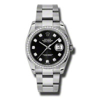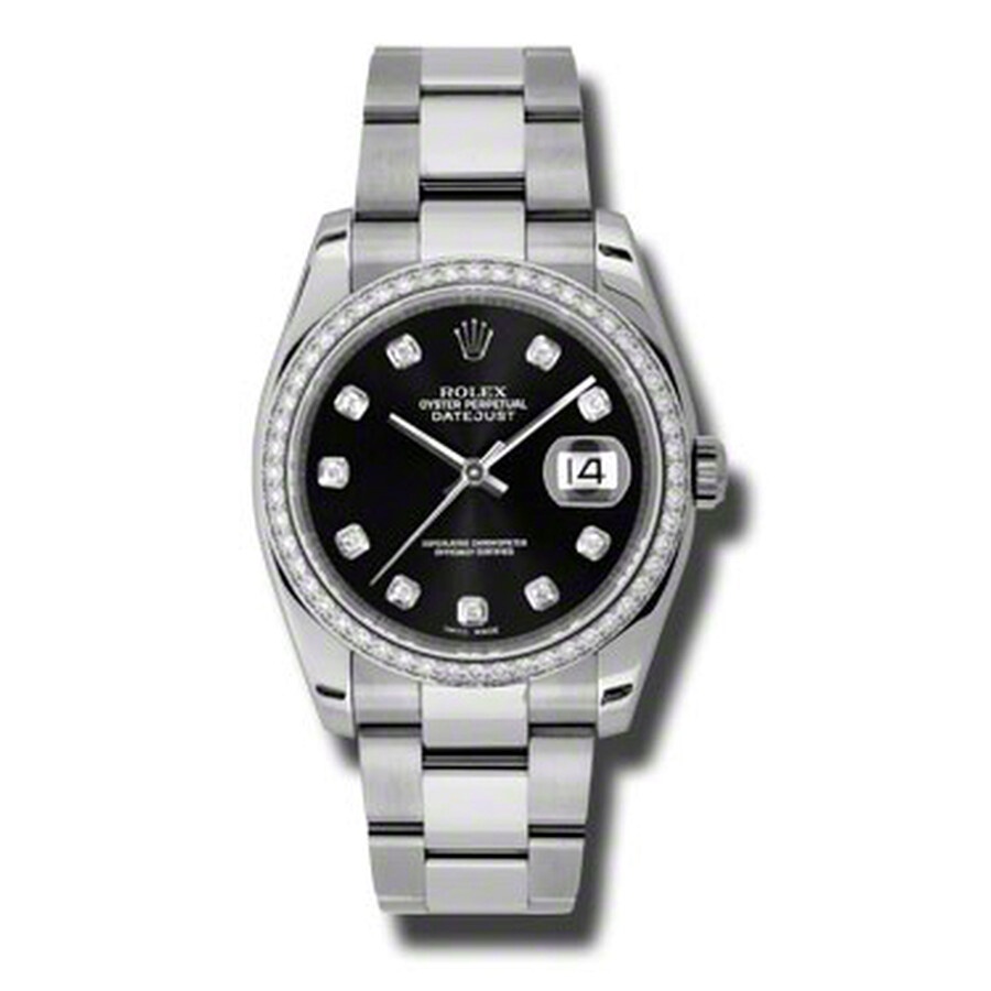 Stainless steel case with a stainless steel rolex oyster bracelet. Fixed - 18k white gold diamond-set bezel. Black dial with silver-tone hands and diamond hour markers. Dial Type: Analog. Date display at the 3 o'clock position. Automatic movement. Scratch resistant sapphire crystal. Screw down crown. Case diameter: 36 mm. Round case shape. Oysterclasp clasp. Water resistant at 100 meters / 330 feet. Functions: date, hour, minute, second. Luxury watch style. Watch label: Swiss Made. Rolex Oyster Perpetual Datejust 36 Black Dial Stainless Steel Rolex Oyster Automatic Ladies Watch 116244BKDO. GENERAL Color: Black INFORMATION Brand: Rolex Series: Oyster Perpetual Collection Name: Oyster Perpetual Gender: Womens Model: 116244BKDO Watch Label: Swiss Made Movement: Automatic Engine: Rolex Calibre 3135 Power Reserve: 50 hours CASE Case Size: 36 mm Case Color: Silver-Tone Case Material: Stainless Steel Case Shape: Round Case Back: Solid BAND Band Material: Stainless Steel Rolex Oyster Band Type: Bracelet Band Color: Silver-tone Clasp: Oysterlock DIAL Dial Color: Black Type: Analog Crystal: Scratch Resistant Sapphire Hands: Silver-tone Dial Markers: Diamond Bezel: Fixed Bezel Color: 18kt White Gold Bezel Material: Diamond Set Crown: Screw Down FEATURES Water Resistance: 100 meters / 330 feet Calendar: Date display at the 3 o'clock position Functions: Date, Hour, Minute, Second, Chronometer Watch Features: Analog, Chronometer, Perpetual, Gold, Stainless Steel, Diamond ADDITIONAL INFO Watch Style: Luxury Warranty: 2 Year Jomashop Warranty UPC Code: 845960075596 Jomashop Sku: RLX116244BKDO Department: Watches Category: Watches