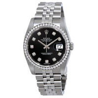 Stainless steel case with a stainless steel Rolex jubilee bracelet. Fixed 18kt white gold diamond-set bezel. Black dial with silver-tone hands and diamond hour markers. Dial Type: Analog. Date display at the 3 o'clock position. Rolex calibre 3135 automatic movement with a 50-hour power reserve. Scratch resistant sapphire crystal. Screw down crown. Solid case back. Case size: 36 mm. Round case shape. Concealed crown clasp. Water resistant at 100 meters / 330 feet. Functions: date, hour, minute, second, chronometer. Luxury watch style. Watch label: Swiss Made. Rolex Oyster Perpetual Datejust 36 Black Dial Stainless Steel Rolex Jubilee Automatic Ladies Watch 116244BKDJ. GENERAL Color: Black INFORMATION Brand: Rolex Series: Oyster Perpetual Collection Name: Oyster Perpetual Gender: Womens Model: 116244BKDJ Watch Label: Swiss Made Movement: Automatic Engine: Rolex Calibre 3135 Power Reserve: 50 hours CASE Case Size: 36 mm Case Color: Silver-Tone Case Material: Stainless Steel Case Shape: Round Case Back: Solid BAND Band Material: Stainless Steel Rolex Jubilee Band Type: Bracelet Band Color: Silver-tone Clasp: Concealed Crown DIAL Dial Color: Black Type: Analog Crystal: Scratch Resistant Sapphire Hands: Silver-tone Dial Markers: Diamond Bezel: Fixed Bezel Color: 18kt White Gold Bezel Material: Diamond Set Crown: Screw Down FEATURES Water Resistance: 100 meters / 330 feet Calendar: Date display at the 3 o'clock position Functions: Date, Hour, Minute, Second, Chronometer Watch Features: Analog, Chronometer, Perpetual, Gold, Stainless Steel, Diamond ADDITIONAL INFO Watch Style: Luxury Warranty: 2 Year Jomashop Warranty UPC Code: 845960075589 Jomashop Sku: RLX116244BKDJ Department: Watches Category: Watches