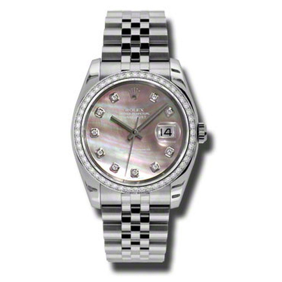 Stainless steel case with a stainless steel rolex jubilee bracelet. Fixed - 18k white gold diamond-set bezel. Black mother of pearl dial with silver-tone hands and diamond hour markers. Dial Type: Analog. Date display at the 3 o'clock position. Automatic movement. Scratch resistant sapphire crystal. Screw down crown. Case diameter: 36 mm. Round case shape. Concealed crown clasp. Water resistant at 100 meters / 330 feet. Functions: date, hour, minute, second. Luxury watch style. Watch label: Swiss Made. Rolex Oyster Perpetual Datejust 36 Black Mother of Pearl Dial Stainless Steel Rolex Jubilee Automatic Ladies Watch 116244BKMDJ. GENERAL Color: Black / Mother of pearl INFORMATION Brand: Rolex Series: Oyster Perpetual Collection Name: Oyster Perpetual Gender: Womens Model: 116244BKMDJ Watch Label: Swiss Made Movement: Automatic Engine: Rolex Calibre 3135 Power Reserve: 50 hours CASE Case Size: 36 mm Case Color: Silver-Tone Case Material: Stainless Steel Case Shape: Round BAND Band Material: Stainless Steel Rolex Jubilee Band Type: Bracelet Band Color: Silver-tone Clasp: Concealed Crown DIAL Dial Color: Black Mother of Pearl Type: Analog Crystal: Scratch Resistant Sapphire Hands: Silver-tone Dial Markers: Diamond Bezel: Fixed Bezel Color: 18kt White Gold Bezel Material: Diamond Set Crown: Screw Down FEATURES Water Resistance: 100 meters / 330 feet Calendar: Date display at the 3 o'clock position Functions: Date, Hour, Minute, Second, Chronometer Watch Features: Analog, Chronometer, Perpetual, Gold, Stainless Steel, Diamond ADDITIONAL INFO Watch Style: Luxury Warranty: 2 Year Jomashop Warranty UPC Code: 845960075626 Jomashop Sku: RLX116244BKMDJ Department: Watches Category: Watches