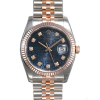 Stainless steel and 18k everose gold case with a stainless steel and 18k everose gold rolex jubilee bracelet. Fixed - fluted 18k everose gold bezel. Blue jubilee dial with rose gold-tone hands and diamond hour markers. Dial Type: Analog. Date display at the 3 o'clock position. Automatic movement. Scratch resistant sapphire crystal. Case diameter: 36 mm. Round case shape. Concealed crown clasp. Water resistant at 100 meters / 330 feet. Functions: date, hour, minute, second. Luxury watch style. Watch label: Swiss Made. Rolex Oyster Perpetual Datejust 36 Blue Jubilee Dial Stainless Steel and 18K Everose Gold Rolex Jubilee Automatic Men's Watch 116231BLJDJ. GENERAL Color: Blue / Gold / Rose CASE Case Size: 36 Case Material: Stainless Steel and 18kt Everose Gold Case Shape: Round BAND Band Material: Stainless Steel and 18K Everose Gold Rolex Jubilee Band Type: Bracelet Band Color: Two-tone (Silver-tone and Gold-tone) Clasp: Concealed crown DIAL Dial Color: Blue Jubilee Type: Analog Crystal: Scratch Resistant Sapphire Hands: Rose Gold-Tone Dial Markers: Diamond Bezel: Fixed Fluted Bezel Material: 18kt Everose Gold Crown: Screw Down INFORMATION Brand: Rolex Series: Oyster Perpetual Collection Name: Oyster Perpetual Gender: Mens Model: 116231BLJDJ Watch Label: Swiss Made Movement: Automatic Engine: Rolex Calibre 3135 Power Reserve: 50 hours FEATURES Water Resistance: 100 meters / 330 feet Calendar: Date display at the 3 o'clock position Functions: Date, Hour, Minute, Second, Chronometer Watch Features: Analog, Chronometer, Perpetual, Gold, Stainless Steel, Diamond ADDITIONAL INFO Watch Style: Luxury Warranty: 2 Year Jomashop Warranty UPC Code: 845960074643 Jomashop Sku: RLX116231BLJDJ Department: Watches Category: Watches