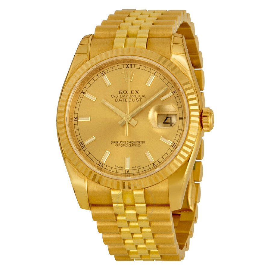 18k yellow gold case with a 18k yellow gold bracelet. Fixed - fluted 18k yellow gold bezel. Champagne dial with yellow gold-tone hands and index hour markers. Minute markers around the outer rim. Dial Type: Analog. Luminescent hands and markers. Date display at the 3 o'clock position. Automatic movement. Scratch resistant sapphire crystal. Screw down crown. Solid case back. Case diameter: 36 mm. Round case shape. Fold over clasp. Water resistant at 100 meters / 330 feet. Functions: date, hour, minute, second. Luxury watch style. Watch label: Swiss Made. Rolex Oyster Perpetual Datejust 36 Champagne Dial 18K Yellow Gold Automatic Men's Watch 116238CSJ. GENERAL Color: Champagne / Gold / Yellow CASE Case Size: 36 Case Material: 18kt Yellow Gold Case Shape: Round Case Back: Solid BAND Band Material: 18kt Yellow Gold Band Type: Bracelet Band Color: Yellow Gold-tone Clasp: Fold Over DIAL Dial Color: Champagne Type: Analog Crystal: Scratch Resistant Sapphire Hands: Yellow Gold-Tone Dial Markers: Index Second Markers: Minute Markers around the outer rim Luminiscence: Hands and Markers Bezel: Fixed Fluted Bezel Material: 18kt Yellow Gold Crown: Screw Down INFORMATION Brand: Rolex Series: Oyster Perpetual Collection Name: Oyster Perpetual Gender: Mens Model: 116238CSJ Watch Label: Swiss Made Movement: Automatic Engine: Rolex Calibre 3135 Power Reserve: 50 hours FEATURES Water Resistance: 100 meters / 330 feet Calendar: Date display at the 3 o'clock position Functions: Date, Hour, Minute, Second, Chronometer Watch Features: Gold, Perpetual, Chronometer, Analog ADDITIONAL INFO Watch Style: Luxury Warranty: 2 Year Jomashop Warranty UPC Code: 845960064071 Jomashop Sku: RLX116238CSJ Department: Watches Category: Watches