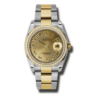 Stainless steel and 18k yellow gold case with a stainless steel and 18k yellow gold rolex oyster bracelet. Fixed - 18k yellow gold diamond-set bezel. Champagne dial with yellow gold-tone hands and Roman numeral hour markers. Minute markers around the outer rim. Dial Type: Analog. Date display at the 3 o'clock position. Automatic movement. Scratch resistant sapphire crystal. Screw down crown. Case diameter: 36 mm. Round case shape. Oysterclasp clasp. Water resistant at 100 meters / 330 feet. Functions: date, hour, minute, second. Luxury watch style. Watch label: Swiss Made. Rolex Oyster Perpetual Datejust 36 Champagne Dial Stainless Steel and 18K Yellow Gold Rolex Oyster Automatic Ladies Watch 116243CSBRO. GENERAL Color: Champagne / Gold / Yellow INFORMATION Brand: Rolex Series: Oyster Perpetual Collection Name: Oyster Perpetual Gender: Womens Model: 116243CSBRO Watch Label: Swiss Made Movement: Automatic Engine: Rolex Calibre 3135 Power Reserve: 50 hours CASE Case Size: 36 mm Case Material: Stainless Steel and 18kt Yellow Gold Case Shape: Round Case Back: Solid BAND Band Material: Stainless Steel and 18kt Yellow Gold Rolex Oyster Band Type: Bracelet Band Color: Two-tone (Silver-tone and Yellow Gold-tone) Clasp: Oysterlock DIAL Dial Color: Champagne Type: Analog Crystal: Scratch Resistant Sapphire Hands: Yellow Gold-Tone Dial Markers: Roman Numeral Second Markers: Minute Markers around the outer rim Bezel: Fixed Bezel Color: 18kt Yellow Gold Bezel Material: Diamond Set Crown: Screw Down FEATURES Water Resistance: 100 meters / 330 feet Calendar: Date display at the 3 o'clock position Functions: Date, Hour, Minute, Second, Chronometer Watch Features: Analog, Chronometer, Perpetual, Gold, Stainless Steel, Diamond ADDITIONAL INFO Watch Style: Luxury Warranty: 2 Year Jomashop Warranty UPC Code: 845960075381 Jomashop Sku: RLX116243CSBRO Department: Watches Category: Watches