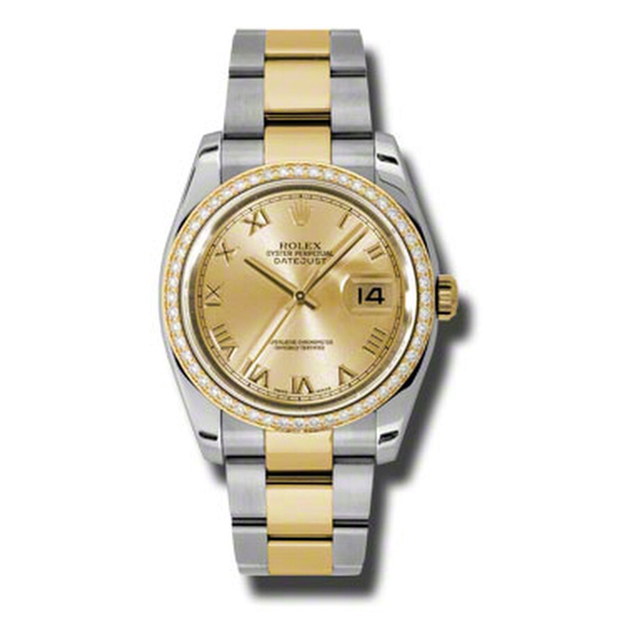 Stainless steel and 18k yellow gold case with a stainless steel and 18k yellow gold rolex oyster bracelet. Fixed - 18k yellow gold diamond-set bezel. Champagne dial with yellow gold-tone hands and Roman numeral hour markers. Minute markers around the outer rim. Dial Type: Analog. Date display at the 3 o'clock position. Automatic movement. Scratch resistant sapphire crystal. Screw down crown. Case diameter: 36 mm. Round case shape. Oysterclasp clasp. Water resistant at 100 meters / 330 feet. Functions: date, hour, minute, second. Luxury watch style. Watch label: Swiss Made. Rolex Oyster Perpetual Datejust 36 Champagne Dial Stainless Steel and 18K Yellow Gold Rolex Oyster Automatic Ladies Watch 116243CRO. GENERAL Color: Champagne / Gold / Yellow INFORMATION Brand: Rolex Series: Oyster Perpetual Collection Name: Oyster Perpetual Gender: Womens Model: 116243CRO Watch Label: Swiss Made Movement: Automatic Engine: Rolex Calibre 3135 Power Reserve: 50 hours CASE Case Size: 36 mm Case Material: Stainless Steel and 18kt Yellow Gold Case Shape: Round Case Back: Solid BAND Band Material: Stainless Steel and 18kt Yellow Gold Rolex Oyster Band Type: Bracelet Band Color: Two-tone (Silver-tone and Yellow Gold-tone) Clasp: Oysterlock DIAL Dial Color: Champagne Type: Analog Crystal: Scratch Resistant Sapphire Hands: Yellow Gold-Tone Dial Markers: Roman Numeral Second Markers: Minute Markers around the outer rim Bezel: Fixed Bezel Color: 18kt Yellow Gold Bezel Material: Diamond Set Crown: Screw Down FEATURES Water Resistance: 100 meters / 330 feet Calendar: Date display at the 3 o'clock position Functions: Date, Hour, Minute, Second, Chronometer Watch Features: Analog, Chronometer, Perpetual, Gold, Stainless Steel, Diamond ADDITIONAL INFO Watch Style: Luxury Warranty: 2 Year Jomashop Warranty UPC Code: 845960075367 Jomashop Sku: RLX116243CRO Department: Watches Category: Watches