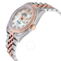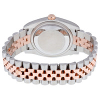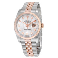 Stainless steel case with a stainless steel Rolex jubilee bracelet with 18kt everose gold center links. Fixed fluted 18kt everose gold bezel. Mother of pearl dial with pink gold-tone hands and diamond hour markers. Dial Type: Analog. Date display at the 3 o'clock position. Automatic movement with a 50-hour power reserve. Scratch resistant sapphire crystal. Screw down crown. Solid case back. Case size: 36 mm. Round case shape. Concealed crown clasp. Water resistant at 100 meters / 330 feet. Functions: date, hour, minute, second. Luxury watch style. Watch label: Swiss Made. Rolex Oyster Perpetual Datejust 36 Mother of Pearl Dial Stainless Steel and 18K Everose Gold Rolex Jubilee Automatic Men's Watch 116231MDJ. CASE Case Size: 36 Case Color: Silver-Tone Case Material: Stainless Steel Case Shape: Round Case Back: Solid BAND Band Material: Stainless Steel and 18kt Everose Gold Rolex Jubile Band Type: Bracelet Band Color: Two-tone (Silver-tone and Gold-tone) Clasp: Concealed Crown DIAL Dial Color: Mother of Pearl Type: Analog Crystal: Scratch Resistant Sapphire Hands: Pink Gold-tone Dial Markers: Diamond Bezel: Fixed Fluted Bezel Material: 18kt Everose Gold Crown: Screw Down INFORMATION Brand: Rolex Series: Oyster Perpetual Collection Name: Oyster Perpetual Gender: Mens Model: 116231MDJ Watch Label: Swiss Made Movement: Automatic Engine: Rolex Calibre 3135 Power Reserve: 50 hours FEATURES Water Resistance: 100 meters / 330 feet Calendar: Date display at the 3 o'clock position Functions: Date, Hour, Minute, Second, Chronometer Watch Features: Analog, Chronometer, Perpetual, Gold, Stainless Steel, Diamond ADDITIONAL INFO Watch Style: Luxury Warranty: 2 Year Jomashop Warranty UPC Code: 845960071185 Jomashop Sku: RLX116231MDJ Item Variation: 116231-63601 Department: Watches Category: Watches