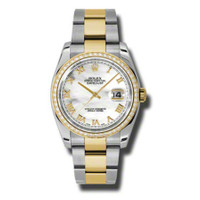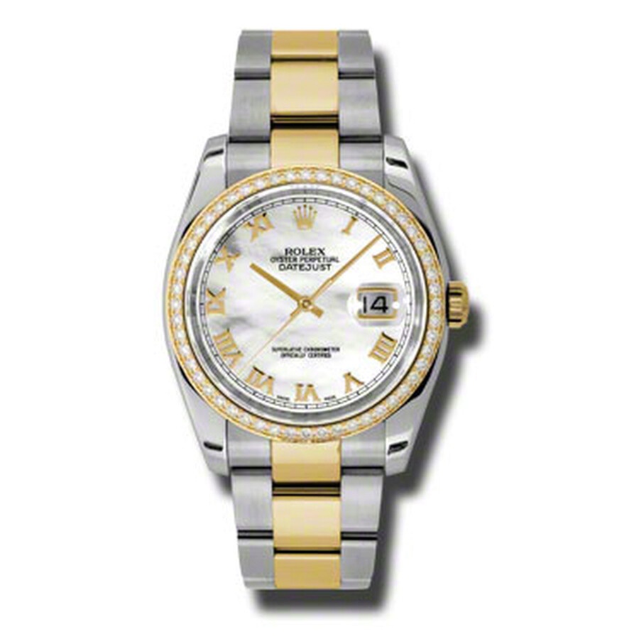 Stainless steel and 18k yellow gold case with a stainless steel and 18k yellow gold rolex oyster bracelet. Fixed - 18k yellow gold diamond-set bezel. Mother of pearl dial with yellow gold-tone hands and Roman numeral hour markers. Minute markers around the outer rim. Dial Type: Analog. Date display at the 3 o'clock position. Automatic movement. Scratch resistant sapphire crystal. Screw down crown. Case diameter: 36 mm. Round case shape. Oysterclasp clasp. Water resistant at 100 meters / 330 feet. Functions: date, hour, minute, second. Luxury watch style. Watch label: Swiss Made. Rolex Oyster Perpetual Datejust 36 Mother of Pearl Dial Stainless Steel and 18K Yellow Gold Rolex Oyster Automatic Ladies Watch 116243MRO. GENERAL Color: Gold / Mother of pearl / Yellow INFORMATION Brand: Rolex Series: Oyster Perpetual Collection Name: Oyster Perpetual Gender: Womens Model: 116243MRO Watch Label: Swiss Made Movement: Automatic Engine: Rolex Calibre 3135 Power Reserve: 50 hours CASE Case Size: 36 mm Case Material: Stainless Steel and 18kt Yellow Gold Case Shape: Round Case Back: Solid BAND Band Material: Stainless Steel and 18kt Yellow Gold Rolex Oyster Band Type: Bracelet Band Color: Two-tone (Silver-tone and Yellow Gold-tone) Clasp: Oysterlock DIAL Dial Color: Mother of Pearl Type: Analog Crystal: Scratch Resistant Sapphire Hands: Yellow Gold-Tone Dial Markers: Roman Numeral Second Markers: Minute Markers around the outer rim Bezel: Fixed Bezel Color: 18kt Yellow Gold Bezel Material: Diamond Set Crown: Screw Down FEATURES Water Resistance: 100 meters / 330 feet Calendar: Date display at the 3 o'clock position Functions: Date, Hour, Minute, Second, Chronometer Watch Features: Analog, Chronometer, Perpetual, Gold, Stainless Steel, Diamond ADDITIONAL INFO Watch Style: Luxury Warranty: 2 Year Jomashop Warranty UPC Code: 845960075473 Jomashop Sku: RLX116243MRO Department: Watches Category: Watches