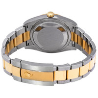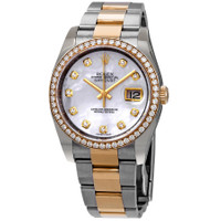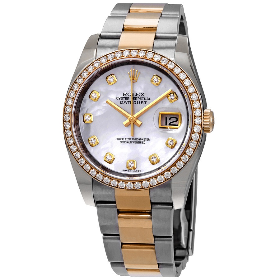 Stainless steel and 18k yellow gold case with a stainless steel and 18k yellow gold rolex oyster bracelet. Fixed - 18k yellow gold diamond-set bezel. Mother of pearl dial with yellow gold-tone hands and diamond hour markers. Dial Type: Analog. Date display at the 3 o'clock position. Automatic movement. Scratch resistant sapphire crystal. Screw down crown. Case diameter: 36 mm. Round case shape. Oysterclasp clasp. Water resistant at 100 meters / 330 feet. Functions: date, hour, minute, second. Luxury watch style. Watch label: Swiss Made. Rolex Oyster Perpetual Datejust 36 Mother of Pearl Dial Stainless Steel and 18K Yellow Gold Rolex Oyster Automatic Ladies Watch 116243MDO. GENERAL Color: Gold / Mother of pearl / Yellow INFORMATION Brand: Rolex Series: Oyster Perpetual Collection Name: Oyster Perpetual Gender: Womens Model: 116243MDO Watch Label: Swiss Made Movement: Automatic Engine: Rolex Calibre 3135 Power Reserve: 50 hours CASE Case Size: 36 mm Case Material: Stainless Steel and 18kt Yellow Gold Case Shape: Round Case Back: Solid BAND Band Material: Stainless Steel and 18kt Yellow Gold Rolex Oyster Band Type: Bracelet Band Color: Two-tone (Silver-tone and Yellow Gold-tone) Clasp: Oysterlock DIAL Dial Color: Mother of Pearl Type: Analog Crystal: Scratch Resistant Sapphire Hands: Yellow Gold-Tone Dial Markers: Diamond Bezel: Fixed Bezel Color: 18kt Yellow Gold Bezel Material: Diamond Set Crown: Screw Down FEATURES Water Resistance: 100 meters / 330 feet Calendar: Date display at the 3 o'clock position Functions: Date, Hour, Minute, Second, Chronometer Watch Features: Analog, Chronometer, Perpetual, Gold, Stainless Steel, Diamond ADDITIONAL INFO Watch Style: Luxury Warranty: 2 Year Jomashop Warranty UPC Code: 845960075459 Jomashop Sku: RLX116243MDO Department: Watches Category: Watches