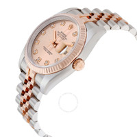 Stainless steel case with a stainless steel Rolex jubilee bracelet with 18kt everose gold center links. Fixed fluted 18kt everose gold bezel. Rose dial with pink gold-tone hands and diamond hour markers. Dial Type: Analog. Date display at the 3 o'clock position. Automatic movement with a 50-hour power reserve. Scratch resistant sapphire crystal. Screw down crown. Solid case back. Case size: 36 mm. Round case shape. Concealed crown clasp. Water resistant at 100 meters / 330 feet. Functions: date, hour, minute, second. Luxury watch style. Watch label: Swiss Made. Rolex Oyster Perpetual Datejust 36 Rose Dial Stainless Steel and 18K Everose Gold Rolex Jubilee Automatic Men's Watch 116231PDJ. GENERAL Color: Gold / Pink / Rose CASE Case Size: 36 Case Color: Silver-Tone Case Material: Stainless Steel Case Shape: Round Case Back: Solid BAND Band Material: Stainless Steel and 18kt Everose Gold Rolex Jubile Band Type: Bracelet Band Color: Silver-tone Clasp: Concealed Crown DIAL Dial Color: Rose Type: Analog Crystal: Scratch Resistant Sapphire Hands: Pink Gold-tone Dial Markers: Diamond Bezel: Fixed Fluted Bezel Material: 18kt Everose Gold Crown: Screw Down INFORMATION Brand: Rolex Series: Oyster Perpetual Collection Name: Oyster Perpetual Gender: Mens Model: 116231PDJ Watch Label: Swiss Made Movement: Automatic Engine: Rolex Calibre 3135 Power Reserve: 50 hours FEATURES Water Resistance: 100 meters / 330 feet Calendar: Date display at the 3 o'clock position Functions: Date, Hour, Minute, Second, Chronometer Watch Features: Analog, Chronometer, Perpetual, Gold, Stainless Steel, Diamond ADDITIONAL INFO Watch Style: Luxury Warranty: 2 Year Jomashop Warranty UPC Code: 845960071277 Jomashop Sku: RLX116231PDJ Item Variation: 116231-63601 Department: Watches Category: Watches