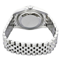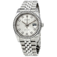 Stainless steel case with a stainless steel Rolex jubilee bracelet. Fixed 18kt white gold diamond-set bezel. Silver dial with silver-tone hands and diamond hour markers. Dial Type: Analog. Date display at the 3 o'clock position. Rolex calibre 3135 automatic movement with a 50-hour power reserve. Scratch resistant sapphire crystal. Screw down crown. Solid case back. Case size: 36 mm. Round case shape. Water resistant at 100 meters / 330 feet. Functions: date, hour, minute, second. Luxury watch style. Watch label: Swiss Made. Rolex Oyster Perpetual Datejust 36 Silver Dial Stainless Steel Rolex Jubilee Automatic Men's Watch 116244SJDJ. GENERAL Color: Gold / Silver / White CASE Case Size: 36 Case Color: Silver-Tone Case Material: Stainless Steel Case Shape: Round Case Back: Solid BAND Band Material: Stainless Steel Rolex Jubilee Band Type: Bracelet Band Color: Silver-tone Clasp: Crownclasp DIAL Dial Color: Silver Type: Analog Crystal: Scratch Resistant Sapphire Hands: Silver-tone Dial Markers: Diamond Bezel: Fixed Bezel Color: 18kt White Gold Bezel Material: Diamond Set Crown: Screw Down INFORMATION Brand: Rolex Series: Oyster Perpetual Collection Name: Oyster Perpetual Gender: Mens Model: 116244SJDJ Watch Label: Swiss Made Movement: Automatic Engine: Rolex Calibre 3135 Power Reserve: 50 hours FEATURES Water Resistance: 100 meters / 330 feet Calendar: Date display at the 3 o'clock position Functions: Date, Hour, Minute, Second, Chronometer Watch Features: Analog, Chronometer, Perpetual, Gold, Stainless Steel, Diamond ADDITIONAL INFO Watch Style: Luxury Warranty: 2 Year Jomashop Warranty UPC Code: 845960075831 Jomashop Sku: RLX116244SJDJ Department: Watches Category: Watches