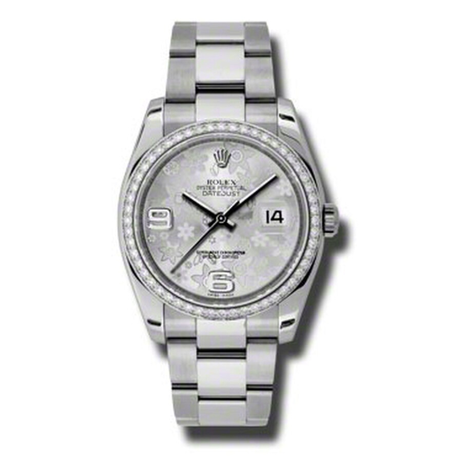 Stainless steel case with a stainless steel rolex oyster bracelet. Fixed - 18k white gold diamond-set bezel. Silver floral dial with silver-tone hands and Arabic hour markers. Dial Type: Analog. Date display at the 3 o'clock position. Automatic movement. Scratch resistant sapphire crystal. Screw down crown. Case diameter: 36 mm. Round case shape. Oysterclasp clasp. Water resistant at 100 meters / 330 feet. Functions: date, hour, minute, second. Luxury watch style. Watch label: Swiss Made. Rolex Oyster Perpetual Datejust 36 Silver Floral Dial Stainless Steel Rolex Oyster Automatic Ladies Watch 116244SFAO. GENERAL Color: Silver INFORMATION Brand: Rolex Series: Oyster Perpetual Collection Name: Oyster Perpetual Gender: Womens Model: 116244SFAO Watch Label: Swiss Made Movement: Automatic Engine: Rolex Calibre 3135 Power Reserve: 50 hours CASE Case Size: 36 mm Case Color: Silver-Tone Case Material: Stainless Steel Case Shape: Round BAND Band Material: Stainless Steel Rolex Oyster Band Type: Bracelet Band Color: Silver-tone Clasp: Oysterlock DIAL Dial Color: Silver Floral Type: Analog Crystal: Scratch Resistant Sapphire Hands: Silver-tone Dial Markers: Arabic Bezel: Fixed Bezel Color: 18kt White Gold Bezel Material: Diamond Set Crown: Screw Down FEATURES Water Resistance: 100 meters / 330 feet Calendar: Date display at the 3 o'clock position Functions: Date, Hour, Minute, Second, Chronometer Watch Features: Analog, Chronometer, Perpetual, Gold, Stainless Steel, Diamond ADDITIONAL INFO Watch Style: Luxury Warranty: 2 Year Jomashop Warranty UPC Code: 845960075824 Jomashop Sku: RLX116244SFAO Department: Watches Category: Watches