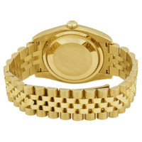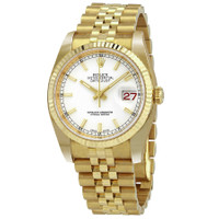 18k yellow gold case with a 18k yellow gold bracelet. Fixed - fluted 18k yellow gold bezel. White dial with yellow gold-tone hands and index hour markers. Dial Type: Analog. Luminescent hands and markers. Date display at the 3 o'clock position. Automatic movement. Scratch resistant sapphire crystal. Screw down crown. Case diameter: 36 mm. Round case shape. Concealed crown clasp. Water resistant at 100 meters / 330 feet. Functions: date, hour, minute, second. Luxury watch style. Watch label: Swiss Made. Rolex Oyster Perpetual Datejust 36 White Dial 18K Yellow Gold Automatic Men's Watch 116238WSJ. GENERAL Color: Gold / White / Yellow CASE Case Size: 36 Case Material: 18kt Yellow Gold Case Shape: Round Case Back: Solid BAND Band Material: 18kt Yellow Gold Band Type: Bracelet Band Color: Yellow Gold-tone Clasp: Concealed Crown DIAL Dial Color: White Type: Analog Crystal: Scratch Resistant Sapphire Hands: Yellow Gold-Tone Dial Markers: Index Second Markers: Minute Markers around the outer rim Luminiscence: Hands and Markers Bezel: Fixed Fluted Bezel Material: 18kt Yellow Gold Crown: Screw Down INFORMATION Brand: Rolex Series: Oyster Perpetual Collection Name: Oyster Perpetual Gender: Mens Model: 116238WSJ Watch Label: Swiss Made Movement: Automatic Engine: Rolex Calibre 3135 Power Reserve: 50 hours FEATURES Water Resistance: 100 meters / 330 feet Calendar: Date display at the 3 o'clock position Functions: Date, Hour, Minute, Second, Chronometer Watch Features: Gold, Perpetual, Chronometer, Analog ADDITIONAL INFO Watch Style: Luxury Warranty: 2 Year Jomashop Warranty UPC Code: 845960075237 Jomashop Sku: RLX116238WSJ Department: Watches Category: Watches