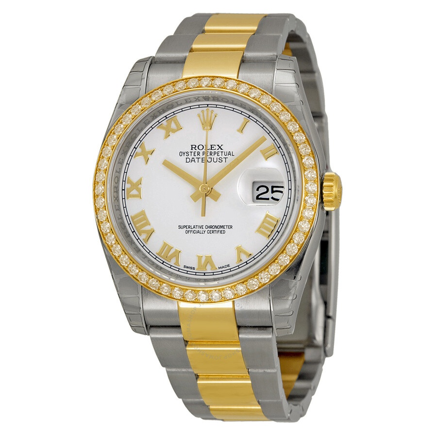 Stainless steel and 18k yellow gold case with a stainless steel and 18k yellow gold rolex oyster bracelet. Fixed - 18k yellow gold diamond-set bezel. White dial with yellow gold-tone hands and Roman numeral hour markers. Minute markers around the outer rim. Dial Type: Analog. Date display at the 3 o'clock position. Automatic movement. Scratch resistant sapphire crystal. Screw down crown. Case diameter: 36 mm. Round case shape. Oyster clasp. Water resistant at 100 meters / 330 feet. Functions: date, hour, minute, second. Luxury watch style. Watch label: Swiss Made. Rolex Oyster Perpetual Datejust 36 White Dial Stainless Steel and 18K Yellow Gold Rolex Oyster Automatic Ladies Watch 116243WRO. GENERAL Color: Gold / White / Yellow INFORMATION Brand: Rolex Series: Oyster Perpetual Collection Name: Oyster Perpetual Gender: Womens Model: 116243WRO Watch Label: Swiss Made Movement: Automatic Engine: Rolex Calibre 3135 Power Reserve: 50 hours CASE Case Size: 36 mm Case Material: Stainless Steel and 18kt Yellow Gold Case Shape: Round Case Back: Solid BAND Band Material: Stainless Steel and 18kt Yellow Gold Rolex Oyster Band Type: Bracelet Band Color: Two-tone (Silver-tone and Yellow Gold-tone) Clasp: Oysterlock DIAL Dial Color: White Type: Analog Crystal: Scratch Resistant Sapphire Hands: Yellow Gold-Tone Dial Markers: Roman Numeral Second Markers: Minute Markers around the outer rim Bezel: Fixed Bezel Color: 18kt Yellow Gold Bezel Material: Diamond Set Crown: Screw Down FEATURES Water Resistance: 100 meters / 330 feet Calendar: Date display at the 3 o'clock position Functions: Date, Hour, Minute, Second, Chronometer Watch Features: Analog, Chronometer, Perpetual, Gold, Stainless Steel, Diamond ADDITIONAL INFO Watch Style: Luxury Warranty: 2 Year Jomashop Warranty UPC Code: 845960062374 Jomashop Sku: RLX116243WRO Department: Watches Category: Watches